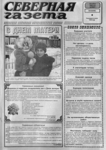 &В®В@¡¡03в 25 н о я б р я 2004 года ЧЕТВЕРГ № 4 8 (8 04 8 ) О с н о в а н а в и ю н е 1935 года ч У Ч т о м о ж е т б ы т ь п р е к р а с н е е в м и р е , ч е м м а т е р и н с т в о ? Д е т и н а п о л н я ю т ж и з н ь с м ы с л о м , д е л а ю т е е д о б р е е и м у д р е е , н е с у т р а д о с т ь и с ч а с т ь е в к а ж д ы й п р о ж и т ы й и з а в т р а ш н и й д е н ь . эри! Уважаемые северянки! Искренне и сердечно поздравляем вас с Днем мате , В р о с с и й с к о м к а л е н д а р е э т о т п р а з д н и к п р и х о д и т с я н а о с е н н ю ю д а т у , н о с о п р о в о ж д а ю т е г о в е - ’ с е н ^ и е ч у в с т в а т е п л а , у ю т а и д о б р о т ы . П р а з д н и к в с е н а р о д н ы й , с в я щ е н е н д л я к а ж д о г о и з н а с , п о т о м у ч т о н е т н а с в е т е б о л е е в о з в ы ш е н н о г о , м и л о г о и б л и з к о г о ч е л о в е к а , ч е м м а т ь . Н и з к и й в а м п о к л о н , д о р о г и е м а т е р и ! В ы з а с л у ж и в а е т е в ы с о ч а й ш е й б л а г о д а р н о с т и о к р у ж а ю щ и х , д о ч е р н е й и с ы н о в н е й л ю б о в ь ю , п р и з н а т е л ь н о с т и з а в а ш м а т е р и н с к и й т р у д , т е р п е н и е и б л а г о р о д с т в о , з а с о ц и а л ь н о е н е р а в н о д у ш и е в р е ш е н и и п р о б л е м , с т о я щ и х п е р е д б о л ь ш и н с т в о м , з а к о н к р е т н ы й в к л а д в р а з в и т и е р о д н о г о р а й о н а . Ж е л а е м в а м д о б р о г о з д о р о в ь я , б л а г о п о л у ч и я в с е м ь я х , и с т и н н о г о м а т е р и н с к о г о с ч а с т ь я . С п р а з д н и к о м ! щ **. . Т ы н е в з о л о т е , т ы н е в ж е м ч у г е , И о д е ж д а , к а к п о с т у п ь , п р о с т а , В с я и з с к р о м н о с т и - п р о с т о ж е н щ и н а - В с я н е б р о с к а я к р а с о т а . Т ы з а б о т л и в а я и в н и м а т е л ь н а я , Т в о и р у к и к а к д в а к р ы л а , Р у к и ж е н щ и н ы , р у к и м а т е р и , С т о л ь к о д е л а ю щ и е д о б р а . И . о . г л а в ы т е р р и т о р и а л ь н о й а д м и н и с т р а ц и и В. П .Ж О Р О В . И. о . п р е д с е д а т е л я т е р р и т о р и а л ь н о г о С о в е т а д е п у т а т о в А. Е. ХРАМУШИН. Уважаемые избиратели! С 2 0 н о я б р я 2 0 0 4 г о д а н а ч а л о с ь д о с р о ч н о е г о л о с о в а н и е . И з б и р а т е л и , к о т о р ы е п о у в а ж и т е л ь н о й п р и ч и н е н е с м о г у т п р и й т и в д е н ь в ы б о р о в 5 д е к а б р я 2 0 0 4 г. н а и з б и р а т е л ь н ы е у ч а с т к и , м о г у т п р о г о л о с о в а т ь д о с р о ч н о в п о м е щ е н и я х м у н и ц и п а л ь н ы х и з б и р а т е л ь н ы х к о м и с с и й р а й о н а и с е л ь с о в е т о в . В м у н и ц и п а л ь н о й и з б и р а т е л ь н о й к о м и с с и и С е в е р н о г о р а й о н а - з а г л а в у С е в е р н о г о р а й о н а и д е п у т а т о в С о в е т а д е п у т а т о в С е в е р н о г о р а й о н а , п о а д р е с у с . С е в е р н о е , у л . Л е н и н а , 14, к а б . 3 1 5 , т е л . 2 1 - 1 9 0 . В и з б и р а т е л ь н ы х к о м и с с и я х м у н и ц и п а л ь н ы х о б р а з о в а н и й с е л ь с о в е т о в - з а г л а в у и д е п у т а т о в С о в е т а д е п у т а т о в с в о е г о м у н и ц и п а л ь н о г о о б р а з о в а н и я . С о 2 п о 4 д е к а б р я 2 0 0 4 г. д о с р о ч н о п р о г о л о с о в а т ь м о ж н о н а и з б и р а т е л ь н о м у ч а с т к е п о м е с т у ж и т е л ь с т в а п о в с е м ч е т ы р е м у р о в н я м в ы б о р о в . П р е д с е д а т е л ь м у н и ц и п а л ь н о й и з б и р а т е л ь н о й к о м и с с и и С е в е р н о г о р а й о н а Т. Е. БУЧЕВАЯ. г — т п п з з в п в и е з Будущие у ч и т е л я В районе у тве ржде на ц ел е ва я п р о гр ам м а «Дети С е в е р - I ного р ай о н а на 2 0 0 4 - 2 0 0 6 г о д ы » . П л а н и р у е м а я ц е л е н а п - | р авленная работа в этом н а п р а в л е н и и п р и н о с и т с в о и пло - | ды: п о с т у п а е м о с т ь в высшие у ч е б н ы е з а в е д е н и я о д а р е н - ■ ных выпускни ко в остается 