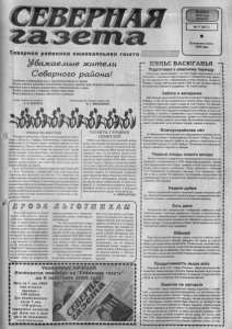 Северная районная еженедельная газета у в а ж а е м ы е жители С е в е р н о г о р а й о н а ! Сердечно поздравляем вас с праздником Весны и Труда! П у с т ь т е п л о е весеннее н а с т р о е н и е п о с е т и т каждый дом, в с е л и т надежду и у в е р е н н о с т ь , с п л о т и т всех в общем с т р е м л е н и и к благополучию и миру. П у с т ь славными и добрыми б у д у т наши дела. Всем здоровья, с ч а с т ь я , д о с т а т к а и успехов. Г л а в а С е в е р н о г о р а й о н а П р е д с е д а т е л ь С о в е т а д е п у т а т о в А . И. К О З У Б Е Ц . В. Г. И В А Ш К Е В И Ч . УРОКИ МУЖЕСТВА ч У ч а с т в у я в р а й о н н о м и о б л а с т н о м к о н к у р с а х п о п о д г о т о в к е к 6 0 - л е т и ю П о б е д ы , б и б л и о т е к а р ь Н о в о т р о и ц к о й б и б л и о т е к и Е . В . Л а п е н к о в е д е т а к т и в н у ю р а б о т у в э т о м н а п р а в л е н и и . П е р в о е м е р о п р и я т и е , о т к р ы в ш е е цикл, н а з ы в а л о с ь « Н е п о м е р к н е т с л а в а т е х в о е н н ы х л е т » . З а т е м е г о п р о д о л ж и л « У р о к м у ж е с т в а » , на к о т о р о м д е т и из к л у б а « Р о с т о ч е к » в с т р е т и л и с ь с у ч а с т н и к о м в о й н ы С . И . Б а к а л о в ы м . О н и п р и ш л и к н е м у д о м о й , п р и н е с л и и з г о т о в л е н н ы й с в о и м и р у к а м и т о р т , п и л и ч а й , п е л и п е с н и , ф о т о г р а ф и р о в а л и с ь н а п а м я т ь . Б ы л а о р г а н и з о в а н а в с т р е ч а и с д р у г и м у ч а с т н и к о м в о й ны - В . М . П е т у х о в ы м , с т р у ж е н и ц е й т ы л а , у ч а с т в у ю щ е й в с т р о и т е л ь с т в е а э р о п о р т а на Ч у к о т к е , П . И . З в е р е в о й . П о их б и о г р а ф и я м у ч а щ и е с я о з н а к о м и л и с ь с д о л г и м и в е р с т а м и б о е в о г о п у т и к П о б е д е . И ч и т а т е л ь с к и е к о н ф е р е н ц и и с ю н о ш е с т в о м с е л а п о п р о и з в е д е н и я м Б . В а с и л ь е в а « А з о р и з д е с ь т и х и е » и М . Ш о л о х о в а « С у д ь б а ч е л о в е к а » с п р о с м о т р о м в и д е о ф и л ь м о в в ы з в а л и о ж и в л е н н ы й з а и н т е р е с о в а н н ы й р а з г о в о р н а т е м у п а т р и о т и ч е с к о г о в о с п и т а н и я и п р е д а н н о с т и Р о д и н е . ТАЛАНТЫ ГЛУБИНКИ СИБИРСКОЙ Р е б я т а и з Б е р г у л ь с к о й с р е д н е й ш к о л ы с т а л и у ч а с т н и к а м и м е ж д у н а р о д н о г о к о н к у р с а « К о с м о с и я». У ч е н и ц а 9 к л а с с а О л я Ч а л - к о в а и ш е с т и к л а с с н и к В а н я А р м а н ч е в м о г у т г о р д и т ь с я т е м , ч т о и х р а б о т ы в о ш л и в с о с т а в п я т и д е с я т и п о б е д и т е л е й . В с е г о н а к о н к у р с б ы л о п р е д с т а в л е н о 2 0 0 0 р а б о т с о в с е х у г о л к о в Р о с с и и . Р е б я т а г о т о в и л и с в о и р а б о т ы в о ч е н ь к о р о т к и й с р о к , т а к как п р и г л а ш е н и е п р и н я т ь у ч а с т и е в э т о м к о н к у р с е п р и ш л о с л и ш к о м п о з д н о . Н о б л а г о д а р я с т а р а н и я м д в у х п е д а г о г о в , В е р ы И в а н о в н ы С о л о д я н к и - н о й и П о л и н ы Г р и г о р ь е в н ы Х а л я в а , н а г р а д ы н а ш л и с в о и х п о б е д и т е л е й . В с в о ю о ч е р е д ь В. И. С о л о д я н к и н а п р и в е з л а г р а м о т ы , в р у ч е н и е к о т о р ы х с о с т о я л о с ь в Б о л ь ш о м з а л е ф и л а р м о н и и г о р о д а Н о в о с и б и р с к а . А . А В Е Р Ь Я Н О В А . Х о р о ш и й п о д а р о к п о л и н и и с о ц и а л ь н о й з а щ и т ы п о л у ч а т г р а ж д а н е , п о л ь з у ю щ и е с я л ь г о т а м и . В н а ш е м р а й о н е о т о п л е н и е - о д н а и з г л а в н ы х п р о б л е м , п о э т о м у н а ч а т о о ч е н ь в а ж н о е и н у ж н о е д е л о : л ь г о т н и к а м п р и в о з я т д р о в а . П о ш е с т ь к у б о м е т р о в о н и м о г у т п о л у ч и т ь б е с п л а т н о , а п р и ж е л а н и и 12 к у б о 
