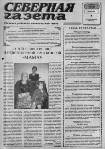 г г 1 декабря 2005 года ЧЕТВЕРГ Л № 4 8 ( 8 1 0 2 ) Основана в июне 1935 года V ____________________________4 т § 3 0 ^ --- -------------------------------------------------------------------- р УВАЖАЕМЫЕ ЖИТЕЛИ СЕВЕРНОГО РАЙОНА! 27 н о я б р я м ы о т м е т и л и Д е н ь м а тер и . Быть матер ью - с амый на стоящ ий труд, о г ром ная от вет ственность за судьбу ребен ка . Вот по чему о тно с и ть с я к этому надо с огромным уважением и почтением . Такое отнош е ни е имеет г л у бо кие корни в нашей культуре ; достаточно вспомнить , к а к много связано с по н ят и ям и Родина- мать, м а т ь - п р и р о д а . . . Сегодня материнство с та л ки в ае тс я с серьезными вызовами. Но надо по мн ит ь о том, ч то с е мья, гл авной хран ител ьниц ей которой всегда была и о стае тся женщина , и в н аш е в р е м я - основа ж и зн ед ея тел ь но с ти и г а р а н т со хран но сти общества . Я же лаю всем ж е нщ и нам с ча стья , здоровья, л ю б в и ! Пусть ваши дети всегда р а д ую т вас! Д е п у т а т Г о с у д а р с т в е н н о й Д у м ы П.В . П Е П Е Л Я Е В £ £ --------------------------- ------------------------------------------------------------------------------- . О ТОЙ ЕДИНСТВЕННОЙ И НЕПОВТОРИМОЙ, ИМЯ КОТОРОЙ «МАМА!» Г — П 9 Л Ь С В А С Ю Г А Н Ь Я « Концерт юбиляру Д в а д ц а т ь пять лет отработала Ж.Л. Панарина у чителем ино - I с тр а н н о го я зы ка в Удар ницкой школе . Сейча с она - завуч. И о | ю б и л е е учительницы не забыли ее ученики. Они по святили ей | к о н ц е р т ху дожественной самодеятельности, который по см о т р е - | ли жи те ли се ла . Ученики 4 - 9 кла ссов с уважением п о с вя ти л и св ои пе сни и д р у гим педагогам школы. А ваза, по даренная юби - ' ляру, ста не т памятным подарком, отметившим веху пути педа- I гога. Благоустраивают село З а по следни е годы в О ста ни нке ведется большая работа п о | б л а г о у с тр о й с т в у села. К омиссии, депутаты пр оверяют с а н ит ар - ■ ное с о с т о я н и е усадеб и обязывают их хозяев содержать с в о е , подворье в надлежащем порядке. И это возымело свое действие. При подведении итогов соревнования по благоустройству в числе I л у ч ш и х о к а за л и с ь че ты рнадца ть усадеб. Среди них; д в о р ы В.В. | Ч е р н о в а , В.Е. Капо риков а , П.Н. Наприенко , Л.Н. Крам ской , Т.Н. I М иха леви ч , В.Н. Махныткина. Мама - это с а м о е п е р в о е с к а з а н н о е с л о в о в ж и з н и ч е л о в е к а Нет никого д орож е и ближе, ч е м мать. И с к о л ь ко б ы тебе не б ы л о л е т , ты все гда остаеш ь ся ребен ком д л я той е д и нс т вен ной , ко т о р а я в с ю с в о ю ж и з н ь п о с в я т и л а т § б е . Э т о о н а - мама р а д о в а л а с ь твоим пе рвы м ша гам, с л о в а м , успех а м . Э т о о н а - м а м а п о м о г а л а т е б е п е р е ж и т ь пе рвы е неудачи и р а з о ч а р о в а н и я . Это она - мама научила тебя любить и б ы т ь любимы м . Клавдия Ефрем о в н а С о т н и к о в а воспи тала сына и д о ч ь С е й ч а с ей с е м ь д е с я т п я т ь лет, но ее ж и з н е н н о м у п о т е н ц и а л у м ож н о то л ь к о п о з а в и д о в а т ь . А с к о л ь ко б е с с о н ны х ночей ей при ш л о с ь пережить , с ко л ь ко раз она у т и р а л а с ле зы , р а с с т а в а я с ь со с в о и м и д е т ь м и . Р а с с т а в а т ь с я п р и х о д и л о с ь потому, что в селе По т ю к а н о в о , где они жили, была то л ько н а чальная школа. Каждое их в о з в р ащ е н и е д о м о й б ы л о для К л ав дии Е ф р е м о в ны на стоящ им п р а зд н иком . Д ети всегда по м о г а ли матер и , по этом у у К. Е. Со тни ко в о й б ы л а у в е р е н н о с т ь в ' т о м , ч то в ее от сутствие все будет сдел а н о в о в р е м я . К л а в д и я Е ф р е м овна никогд а не кричала на с в о их д етей, а тем более никог