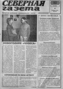 Северная рай о н н а я еженеаеяьная газета Н О В О Г О Д Н И Е «ЧУДЕСА » Новогодние праздники принесли много радости и взрослым, и д е т ям , которые всегда ищут чуда в Новогоднюю ночь. Для многих ребят из нашего района та к и е чудеса начались з а долго до 31 декабря. Так, к примеру, у ч е н и ц а Ч у в а ш и н с к о й школы Д арья Аверченко стала • у ч а с т н и ц е й о б щ е р о с с и й с к о й «Пре зи д ен тс к о й елки» . Выбор пал на эту девочку потому, что она очень активно участвует в общ ественной жизни школы, к тому ж е хорошо учится. С вои ми в печатлениями о т увиденного Д а ш а поделилась с ребя та ми, которые прибыли на став шую уже традиционной районную «Елку Главы». Эта елка уже дал е ко не первая, многие ребя та приглашаются на нее каждый год. Т а к происходит потому, что они п р и л а г а ю т в с е у с и л и я к тому, чтобы в их д н е в н и к а х и тетрад ках стояли только «пятерки». В этот Новый год Д е д М о роз п р и г л а с и л на та кую е л к у сразу 140 мальчишек и девчонок со второго по восьмой классы. Каждый из них пришел домой , д ер ж а в руках сла дкие подарки от Д е д а Мороза . Деньги н а проведение этого мероприят и я выделены главой н а ш е г о района А. И. Козубцом. П р ош л а е щ е о д н а е л к а , но то ль ко у ж е в го р о д е Н о в о с и бирске И называется эт а елка - Г у б е р н а т о р с к о й . Н а э т о м п р а з д н и к е п о б ы в а л и в о с е м ь н аш и х ребят, все они у ч а щ и е с я из ш к о л н а ш е г о р а й о н а . С л е д у е т отметить, что проезд и организацию этого м е ропри ятия т а к ж е опл а ти л а районн ая адм инистрация . В канун е щ е о д н о го новогоднего праздника - Рождества Х р и с т о в а , п р и е м н а я с е м ь я Ковган , п р о ж и в а ю щ а я в с ел е С е в е р н о е , с т а л а у ч а с т н и ц е й Р о ж д е с т в е н с к о й а к ц и и « С в е т д обра» . Поех ала на торжество эта семья потому, что о р ган и з а т о р ы п о с т а в и л и у с л о в и е - семья должна быть о б р а з о в а на после 1 января 2 0 0 5 года. Дл я участников этой а кции был приготовлен концерт и новогодние подарки. А прошло это мероприятие в городе Новосибирске в Белом з а л е кино т еа тра имени Маяковского . Ещ е одним из замечатель ных событий этих праздничных дней стало вручение подарков д е т я м -и н в а л и д а м . О коло 5 0 0 т а к и х сл а д к и х б а н о к - с о б а ч е к были подарены детям с ограниченными возможностями в канун Нового года. Обл адател я ми таких великолепных подарков стали все дети - сироты, находящиеся на попечении; дети - сироты, проживающие в учреждениях общественного воспитания, а т а кж е дети, которые не посещают дош кольные учреждения. А спонсором этого благого дела стало ОАО «Ново- сибирскнефтегаз», это они помогли р е б я т а м с т а т ь ч уточку сч астливее и забыть о своих недугах хотя бы на время. А. А В Е Р Ь Я Н О В А . На с н и м к е С п е ц и а л и с т Упр авл ения о б р а з о в а н и я Н. М. И в а н ч е н к о в р у ч а е т п о д а р о к Яне Пиуновой. * СОРЕВНОВАНИЯ ПО М И Н И - Ф У Т Б О Л У С пор тивная жизнь района - это барометр, по которому можно определить уровень интер е с о в м о л о д е ж и , е е у в л е ч е н и я и с о с т о я н и е здоровья. И то, что она н е з а т у х а е т и зимой, говорит о положительных те н д е н ц и я х в развитии спорта. Н едавно это подтвердили пр ош ед шие в Граж данце во соревнования по мини-футболу. И первое, что нужно отметить - организацию мер оприятий . Х орош о ра с ч ищ е н н а я площ ад к а , горяче е питание, пирожки тож е сыграли свою п о л о
