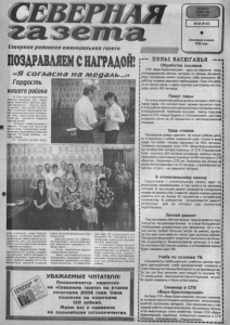 Основана в июне 1935 года Северная районная еженедельная газета — пальс В А С Ю Г А Н Ь Я — О б р а б о т к а п о с е в о в СПК «Верх-Красноярский» - одно из немногих сельхозпредприятий района, которое по своему ф и н а н с о вому положению может позволить себе проводить обработку посевов зерновых гербицидами. Пока эта работа не начата нигде, а здесь сорняки уничтожены на площади около 400 гектаров. «Я с о г л а с н а н а м е д а л ь Гордость Щ / Г . ~ нашего района ~ П а ш у т п а р ы По плану хозяйства района должны вспахать 4500 гектаров паров, что соответствует уровню прошлого года. К этой работе приступили механизаторы половины сельхозпредприятий. Наиболее в ы с о к ие темпы п од ъ е м а земли в СПК «Наша Родина» и «Останинский», где пары вспаханы почти на 30 процентов от запл ан ир ов ан но й площади. В этом году в единственном учебном з а в е д е н и и есть с е р е б ряные медалисты . Ш естеро д еву - ш ек -м е д а л и с то к - гордость н а ш е го р а й о н а : Х а р и т о н о в а Н а т а л ь я , Люст А на с т а си я , Виноградова Д а рья, Пурисенко ва А лена, Исмайло- ва Л я н а , К р е с т ь я н о в а Виктория . И все они учились в Северной средней школе! Остались позади волнения и т р е в о г и . П о з а д и вся ш к о л ь н а я жизнь: уроки, консультации, линейки, вечера, бесконечные домашние задания. Что будет впереди - покаж ет время . На в с т ре ч е , которая прохоУ д а р с т и х и и Прошедшие дожди сделали не только доброе дело, но и принесли с собой очередной удар стихии в виде града. Он побил посевы зерновы х на 1624 ге ктарах. Особенно пострадали поля С П К «Верх-Красноярский», где погибли 934 гектара пшеницы. В СПК «Гражданцев- ский» опустело 200 гектаров площадей, занятых овсом. Наполовину уничтожена пшеница на 400 гектарах в СПК «Восход». Акционеры СПК им. Калинина при уборке не досчитаются зерновых на 70 гектарах, а фермерское хозяйство «Сорт» - на двадцати гектарах. К о т о п и т е л ь н о м у с е з о н у П о д г о т о в к а к о т о п и т е л ь н о м у с е з о н у и д е т по нескольким направлениям, в том числе и по заготовке т о п л и в а . В на стоящ ее время проводится конкурсный т ендер на закупку угля. Ставится задача к началу сезона з а в е з т и е г о не м е н е е 50 п р о ц е н т о в к п о т р е б н о м у к о л и ч е с т в у . В р а й ц е н т р е п р о д о л ж а е т с я р е м о н т к о т е л ь н ы х , д в е из к о т о р ы х у ж е п о л н о с т ь ю подготовлены. Л е т н и й р е м о н т Под программу «Ветхое жилье» предполагается строительство четырехквартирника на улице Молодежной. Необходимая документация уже оформлена. Но и с т а рое жилье требует больших затрат на ремонт, однако на эти цели пока имеется только один миллион рублей. Обширный объем работ предстоит выполнить на объ ектах соцкультбыта. Финансирование началось, и в р а й он поступило 600 листов шифера, а в ближайшее время будет завезено еще 700. дила в кабинете главы С е верно го р а й о н а , состоялось т оржест вен ное вручение самой главной на с е годняшний д ень для выпускников школы и для их родителей награды - серебря ной медали. Глава а д м ин ис т ра ц ии С е в е р ного района А .И . Козубец, поздравля я д е в у ш е к , кратко р а с с к а з а л о работе различных отр аслей в р а й оне и выразил надежду на то , что вы п ускни цы в е р н у т с я в р о д н о й район квалиф ицированным и с п е ци али стам и . Директор школы А .А . Т е р е н т ь ев представил д о с т о и н с т в а к а ж дой медалистки, поздравил и пожелал удачи. И 