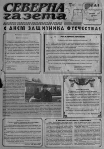ш А I Основана в июне 1935 года с лист защитника отечествА! ГГ Уважаемы е северяне! Дорогие земляки ! 1 . * Поздравляем вас с Днём защитника Отечества! 23 февраля символизирует доблесть и мощь российс кого воинства, славит лучших сынов Отечества. Поэтому в этот день мы в первую очередь поздравляем тех, кто проходит службу или уже отслужил в рядах Вооружённых Сил. Мы отдаём дань уважения вам, офицеры и солдаты! С особой признательностью поздравляем и тех, кто спас человечество от фашистского ига, кто принял удары на себя в Чечне, Афганистане и других локальных вой нах. В этот день мы поздравляем всех представителей сильного пола! Будьте здоровы, счастливыми и благополучны! Пусть сегодня, завтра и всегда будет чистое голубое небо, дети спят спокойно и видят добрые мирные сны. 1 Глава Северного района А.И.КОЗУБЕЦ. Председатель Совета депутатов В.Г.ИВАШКЕВИЧ. ¥ А ☆ УВАЖАЕМЫЕ ЗЕМЛЯКИ! Поздравляем вас с Днем защитника Отечества! ☆ Это праздник кадровых офицеров, навсегда связавших свою судьбу с Вооруженными Сила ми. Это праздник молодых солдат, которые учатся защищать Родину, преодолевая трудности, осваивают воинскую науку. Это праздник очень многих людей, для кого армия олицетворяет надежность, силу духа, верность славным традициям. В этот день мы чествуем и наших ветеранов, всех, кто служил в Вооруженных Силах, кто отважно сражался за свободу и независимость своей страны. В каждой семье бережно хранят память о дедах и отцах, павших на полях сражений. Как самое ценное достояние передают из поколения в поколение их боевые ордена и медали — символы отваги и нравственного вели чия. Сегодня семейные реликвии пополняются наградами и знаками отличия молодых солдат и офицеров, удостоенных ими за свой самоотверженный ратный труд, за мужество и героизм, проявленные при исполнении воинского долга. Желаем ветеранам Вооруженных Сил крепкого здоровья, энергии и оптимизма на долгие годы! ) ^ Счастья и успехов всем, кто несет сегодня боевую вахту по защите Отечества! ☆ Председатель Новосибирского областного Совета депутатов . А.А. БЕСПАЛИКОВ. ☆ Губернатор Новосибирской области В.А. ТОЛОКОНСКИЙ. А А - Возвращаюсь из Федоровки в Се- оное (я уже работал в 1978 году з узле с: (.язи водителем), и ничего не подо- '¡:еваю: все как обычно. Вечером иду, и вся молодежь, в клуб. Немного £с.;,«е пришел отец и сообщает, что ■еня забирают в армию. Пошли мы с , ним немедленно в райвоенкомат. А на утро я и отправился в ряды Советской Армии. Службу проходил в Германии в от дельной истребительной противотанко вой дивизии, - так рассказал о своем внезапном призыве на службу Г енна- дий Николаевич ЯКОВЛЕВ. В настоящее время он уже опытный профессиональный водитель Север ного почтового отделения. За время работы Геннадий Николаевич в коллективе снискал себе почет и уважение. - Добрый, отзывчивый, ответственный и исполнительный сотрудник,- говорит о нем заместитель начальника Куйбышевского почтамта Римма Харисовна Ковтанюк. - Он у нас еще и по совместительству выполняет всю трудную работу заместителя по хозяйственной части. У него никогда не бывает проблем во взаимоотношениях с людьми, умеет найти подход к каждо му человеку. Не считается со своим личным временем. Если необходимо выполнить определенную срочную работу - будет работать и в праздники, и в выходные. И, действительно, после всег