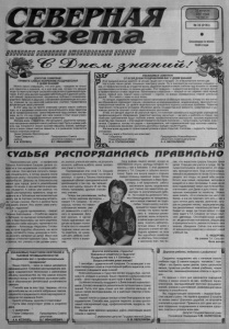 30 августа 2007 года ЧЕТВЕРГ № 35 (8193) Основана в июне 1935 года тввшт ДОРОГИЕ СЕВЕРЯНЕ! ПРИМИТЕ САМЫЕ ИСКРЕННИЕ ПОЗДРАВЛЕНИЯ С ДНЕМ ЗНАНИЙ! Можно смело утверждать, что этот день - праздник не только для педагогов и учеников, но и для всех нас, потому что каждый когда-то переступал порог школьного класса или студенческой ауди тории. В этот день мы все ощущаем себя большой и дружной школь ной семьей: первоклассники, окруженные любовью и вниманием; родители, бабушки и дедушки, с волнением провожающие их в шко лу; ставшие на год взрослей школьники; учителя, торжественно встречающие своих учеников. В этот день мы не просто отмечаем начало нового учебного года, но и выражаем искреннюю признательность всем педагогам за их профессионализм, самоотверженный труд учителя, настав ника, за то, что они отдают все свои знания и опыт юным учени кам, задавая им верные жизненные ориентиры. Желаем всем - педагогам, обучающимся, родителям прекрас ного настроения накануне нового учебного года! Пусть в новом учеб ном году покоряются самые высокие вершины знаний, претворя ются в жизнь самые смелые замыслы, а в дневниках появляются только отличные отметки! Удачи, успехов, благополучия! Глава Северного Председатель Совета района депутатов Северного района А.И. КОЗУБЕЦ. В.Г. ИВАШКЕВИЧ. УВАЖАЕМЫЕ ЗЕМЛЯКИ! ОТ ВСЕЙ ДУШИ ПОЗДРАВЛЯЕМ ВАС С ДНЕМ ЗНАНИЙ! Этот праздник всегда заметен на улицах наших сел и городов. Он в бесконечном потоке цве тов в руках наших детей, спешащих навстречу школе. Он в приподнятом настроении учащихся все, от первоклассников до студентов вузов, радуются первой в новом учебном году встрече со своими наставниками-учителями, со своими друзьями. Этот праздник — в радостном волнении, которое звучит в приветственных словах педагогов. Взволнованы и взрослые — каждый из нас пережил свой первый звонок, первый урок, помнит своих учителей — строгих, но всегда справедливых, помнит школьных друзей... Эта память с нами на всю жизнь. 4 Но сегодня содержание праздника знаний наполняется особенным смыслом, потому что вся систе ма образования переживает подъем, направлена на реформирование, модернизацию, проникнута ин новационным началом. До уровня национального приоритета подняты школьные проблемы. Развитие творческого потенциала молодежи объявлено делом государственной важности, нравственные и ду ховные ценности получают статус национального достояния. И тем, кто сегодня садится за школьные парты, кто начинает заниматься в аудиториях учреждений профессионального образования, предстоит многому научиться — им жить и работать в стране, где главными требованиями будут глубокие знания, профессиональное мастерство, высокие моральные качества. Без сомнения, с этой задачей справится молодое поколение— талантливое, пытливое, энер гичное. Справится, потому что рядом — преподаватели, чей подвижнический труд наполнен новатор ством и искренним желанием воспитать достойных граждан нашей Родины. Желаем всем идущим по стране знаний успехов и ярких открытий. Учителям — мудрости, терпения, оптимизма. Счастья, мира и благополучия всем вам! Губернатор Новосибирской области В. А. ТОЛОКОНСКИЙ. Председатель Новосибирского областного Совета депутатов А. А. БЕСПАЛИКОВ. л СУДЬБА РАСПОРЯДИЛАСЬ ПРЯВМПЬНО Первоначальные шаги в профессию Татьяна Анатольевна Сандзюк дел
