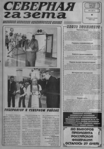 г с 31 января 2008 года ЧЕТВЕРГ №4(8214) Основана в июне 1935 года ГШРНЯТОР В СЕВЕРНОМ РЯЙОНЕ 22 января в Северном районе с визитом побывал Губернатор Новосибирской области В. А. Толоконский. Программа рабочей поезд ки была насыщена встреча ми с жителями района, ко торые встретили Виктора Александровича на главном сдаточном объекте 2007 года - первой очереди куль турно-спортивного центра, сданной в эксплуатацию. Сюда уже вселилось МОУ дополнительного образова ния детей детско-юношес кий клуб физической подго товки «Юность» и Северная детская школа искусств. Губернатор разрезал лен точку, символизирующую от крытие широкого пути юного поколения с. Северного к раз витию талантов. Для этого на объекте созданы все условия, которых давно с нетерпением ожидали и дети, и педагоги, и тренеры. Затем В. А. Толоконский посетил культурно-досуговый центр, где встретился с моло дыми избирателями, впервые участвующими в выборах. Он назвал это событие в их жиз ни ответственным не только для них самих, но и для всей страны, потому что они будут выбирать Президента, а зна чит, и преемственность по литики государства. В. А. Толоконский при нял участие в педагогичес кой конференции работни ков образования «Реализа ция приоритетного нацио нального проекта « Образо вание» в Северном райо не». Губернатор в своем вы ступлении подчеркнул роль и ответственность педаго гов в этом процессе. О. ФЁДОРОВА. На снимках: выступле ние Губернатора и разрезание ленточки на открытии КСЦ. Фото автора. У г - Ш П П В В Презентация | Состоялась презентация книги Л. И Воробьевой, которая рас- I сказала об учителях района, стоявших у истоков" образования, его ■ молодого пополнения. Лидия Ильинична тепло и душевно вспомни- ’ ла в ней о людях, преданных своей профессии, любящих своих вое- I питанников, открывающих широкую дорогу в их дальнейшую жизнь. | Книга была вручена Губернатору В. А. Толоконскому на,совещании педагогов во время его посещения Северного района. ! Лидеры соревнования 1 По итогам соревнования животноводов за 2007 год лидером при- * знан СПК «Останинский», где от коровы в среднем получено по 2475 I килограммов молока В СПК «Верх-Красноярский» второй результат I - 2361 килограмм. В индивидуальном соревновании победителем стал I В. С. Сорочинский из СПК «Останинский». ■ Работа заканчивается ! В хозяйствах района заканчивается вывозка сена. Половина | сельхозпредприятий уже справилась с этой задачей. В остальных на местах заготовки остается около десяти процентов кормов. - Надои выше прошлогодних ] Вторая половина стойлового периода приносит животноводам I дополнительные хлопоты, потому что начинается растел. Нынче он | идет на уровне прошлого года, но средняя продуктивность при этом [ все-таки выше, чем была в минувшую зимовку. Особенно заметно , возросли надои в СПК «Останинский» и СХПК им. К. Маркса * Интересная экскурсия В один из январских дней ученики Верх-Красноярской средней I школы решили выехать в райцентр, где побывали в самых интерес- | ныхдля них местах. И первое из них - музей, где их приветливо ветре- I тила С. М. Останина. Она рассказала об истории создания музея и ! возникновения района. Экскурсию в краеведение С. М. Останина ус- ■ троила так, что ребята поняли, насколько важно знать историю свое- I го родного у гол ка -родины . Н. П. Андреева из Дома детского творче- I: ства преподала 