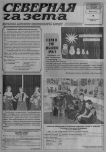 СЕВЕРНАЯ г с 20 марта 2008 года ЧЕТВЕРГ № 12 (8222) Основана в июне 1935 года Об итогах голосования на территории Северного района по выборам Презиаента Российской Федерации 2 марта 2008 года 2 марта 2008 года прошли выборы Президента Российской Федерации. На 22 образованных в районе избирательных участках, число избирателей, внесенных в списки избирателей, составило 7713, на момент окончания голосования 7834 . Всего проголосовало 6047 избирателей, что составило 77,2% к числу избирателей, включенных в список избирателей. Число голосов, распределилось следующим образом: БагдановА.В 1,2%, Жириновский В.В. 10,8%, Зюганов Г.А. 32,9%, Медведев Д.А. 55,1%. Территориальная избирательная комиссия Северного района Уважаемые работники культуры! 25 марта в России отмечается профессиональный празд ник «День работников культуры». Во все времена роль культу ры определялась как чрезвычайно значимая сфера жизнедея тельности человека. Именно культура берет на себя задачу сохранения духовных ценностей и нравственных ориентиров, выступает как качественный показатель уровня жизни обще ства. Благодаря творчеству и повседневному труду работников культуры - сотрудников домов культуры и сельских клубов, биб лиотек и школы искусств, кинофикации и музея - в районном центре, селах и деревнях, в самых отдаленных уголках района сохраняются и преумножаются духовные богатства нашего об щества, культурные традиции нашего народа. Выражаем глубокую благодарность всем работникам куль туры, ветеранам отрасли за ваш самоотверженный подвижни ческий труд. Уверены, что ваш талант, мастерство и предан ность профессии найдут горячий отклик в сердцах жителей нашего района. Желаем Вам, уважаемые работники культуры, празднич ного настроения, новых творческих удач и свершений, здоро вья и благополучия. Глава Северного района Председатель Совета А. И. КОЗУБЕЦ. депутатов В. Г. ИВАШКЕВИЧ. Начальник отдела культуры Администрации Северного района С. Н. СКОРОБОГАТОВА. Коллектив специалистов Гражданцевского Дома культуры ведет активную работупо при влечению населения всех возрастов в народное творчество, художественную самодеятель ность. Большой интересный концерт подгото вили они и к смотру, проходившему под девизом областной программы, посвященной году семьи. Материал оработеДК читайте в следующем номере. _____________________________________________ Приемная се мья Теплинских увеличилась на семь детей. Три девочки и четыре мальчика обрели тепло и уют домашне го очага. А сам Анатолий Иванович практически все 24 часа в сутки находится рядом с ребятами , потому что работает в школе пре подавателем и учит своих приемных сыновей первым навыкам тру да. Материал о семье читайте на 4 странице. ПРЕДСЕДАТЕЛЬ СОВЕТА ДЕПУТАТОВ СЕВЕРНОГО РАЙОНА Новосибирской области Р А С П О Р Я Ж Е Н И Е 11.03.2008 № 7-Р О созыве 21-й сессии Совета депутатов Северного района первого созыва Созвать 21-ю сессию Совета депутатов Северного района первого со зыва 26.03.2008 года в 11-00 в актовом зале администрации Северного рай она (с.Северное, ул.Ленина,14). Предложить на рассмотрение следующие вопросы: - об итогах выполнения плана социально-экономического развития Се верного района за 2007 год; -о выполнении плана мероприятий по наказам избирателей в 2007 году и другие. В.Г. ИВАШКЕВИЧ. ТЕПЛО И УЮТ ДОМАШНЕГО ОЧАГА