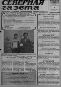 Г Основана в июне 1935 года УВАЖАЕМЫЕ ТРУЖЕНИКИ СЕЛА! Примите самые теплые поздравления в ваш профессиональный праздник - День работ ников сельского хозяйства и перерабатывающей промышленности! Этот год выдался непростым для селян. Но, несмотря ни на что, в будни и праздники, в жару и ненастье, вы продолжаете свою нелегкую работу. Именно такие, как вы, скромные труженики, вносите своим, порой непосильным, крестьянским трудом огромный вклад в благосостояние и историю района. Большое спасибо за ваш тяжелый, изнурительный труд, за теплые руки, выращивающие хлеб, за чуткое отношение к проблемам крестьянства. Пусть будет успешной и плодотворной ваша деятельность, пусть жизненная энергия и бодрость духа помогают в преодолении всех трудностей. Желаем доброго здоровья, пусть праздник вдохновит вас на добрые дела, сплотит вас в общем стремлении к благополучию и процветанию нашего района. Счастья вам, мира и добра! С уважением, Глава Северного района Председатель Совета депутатов Новосибирской области Северного района Новосибирской области А. И. КОЗУБЕЦ. В. Г. ИВАШКЕВИЧ. л е н » - и п п ш в т в т - ■ КОНКУРС ЧТЕЦОВ «ВДОХНОВЕНИЕ» В город Татарск съехались молодые дарования, чтобы посостя заться на отборочном туре конкурса чтецов «Вдохновение», Север ный район там представляли восьмилетняя Аня Руденко и пятнад цатилетняя Маша Безденежных. Было отмечено выступление Маши, она читала со сцены отрывок из поэмы. Другая участница выступила с известной сказкой Корнея Чуковского «Муха-Цокотуха» и прошла в финал, который состоялся в ноябре в Доме актера города Новоси бирска. Аня вернулась домой с дипломом. Его ей вручили за артис тичное исполнение. \ \ МАГАЗИН ОТРЕМОНТИРОВАН Тартасское ТПО закончило большой ремонт в магазине Остяц- ка. И теперь покупателям приятно здесь видеть современные витрины, яркий расклад товаров, линолеум на полу, широкий ассор тимент продукции. А продавец Людмила Ивашкевич всегда рада обслужить всех посетителей магазина. ОСЕННИЕ УТРЕННИКИ И ПОДАРКИ ДЕТЯМ Воспитанники детского садика «Солнышко» получили замеча тельные подарки: мягкие модули для развития двигательной ак тивности, лампы, стульчики на регулируемых ножках. Современ ное оснащение этим оборудованием позволяет воспитателям пол нее использовать потенциал детей в своей творческой работе. НАСТОЯЩИЙ ХОЗЯИН В Чебаковской бригаде содержатся лошади и молодняк. За телятами ухаживает Александр Барков. Он чувствует себя настоя щим хозяином на ферме. Александр не только кормит молодняк, но и производит необходимый ремонт, утепляет двери. И привесы в его группе растут. ТЕХНИКА НА ХРАНЕНИИ После окончательной работы на полях, механизаторы выпол нили вторую главную осеннюю работу. Они поставили на хранение технику, подготовив ее к весне 2009 года. Особенно хорошо с этой работой справились полеводы СПК «Восход», «Наша Родина». В Новосибирске прошел праздник Урожая 2008 года. В нем приняла участие делегация Северного района. По итогам сельского хозяйственного года и за активное участие в выставке район был награж ден Большой Золотой медалью и Дипломом. На снимке: Г. И. Киселева и Т. В. Посаженникова с наградами. ХЛЕБОРОБАМ И ЖИВОТНОВОДАМ Вот и закончилась осенняя страда, уходящего в историю года. Подведены итоги работы в полеводстве. Хлеборобы своев ременно убрали все, что был