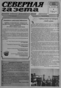 21 мая 2009 года Основана в июне 1935 года С праздником! Год молодежи 1 " Уважаемые работники библиотек! Сердечно поздравляем вас с общероссийским Днем библиотек, с праздником который по праву отмечают те, кто любит чтение и ценит книги. ( В наше время библиотеки являются не только хранителями накопленных человечеством знаний, но и центрами для развития духовности, высокой культуры и нравственного здоровья общества. Всем сотрудникам библиотек Северного района выражаем признательность и благодарность за бескорыстный труд, за стремление сохранить и передать интеллектуальное богатство мирового сообщества. Желаем вам чуткости и терпения в работе с читателям. Профессиональных успехов, счастья и благополучия вам и Вашим семьям! И.о. Главы Северного района Новосибирской области Ю.Г.ГЛАМАЗДИН. Председатель Совета депутатов Северного района Новосибирской области В. Г.ИВАШКЕВИЧ. Начальник отдела культуры и молодежной политики администрации Северного С. Н.СКОРОБОГАТОВА. Директор МУК «Северная централизованная библиотечная система» района Новосибирской области Н. М.НИЧИПОРЕНКО. Уважаемые читатели! 27 мая 2009 года состоится он-лайн конференция руководителя департамента образования Новосибирской области В.В.Иванова. Тема конференции - «Выбор профессии: возможности и предложения профессионального образования». Мы приглашаем вас, задать вопросы руководителю департамента по предложенной теме. Вопросы можно задать, воспользовавшись интернетом и зайдя на информационный портал www.sibkray.ru, позвонив в редакцию нашей газеты или прислав нам письмо. Ответы на ваши вопросы будут опубликованы после 27 мая. «ЗВЁЗДЫ» Звёзды... Интересно наблюдать за их жизнью в ночном небе. Ярко вспыхивает одна, за ней - другая... Высоко-высоко в небе светят звезды... Стало модным нарекать этим высоким словом и земных жителей. Есть «звёзды» балета, «звёзды» шоу- бизнеса, даже в политике перемигиваются между собой «светила» разной величины. БИБЛИОТЕЧНЫЕ А что же на библиотечном небосклоне? Разве там не вспыхивают звёзды, дарящие людям свет человеческого знания, творчества, вдохновения? Сегодня хочется сказать несколько слов о «звездах», которые только появились на нашем библиотечном горизонте. Это молодежь библиотечного дела - А.П. По- корская, В.В. Фролова, Т.В. Гилева, Н.Н. Подскрёбышев. Наши библиотечные «звёздочки» учатся жить в новых экономических условиях, преодолевая, и порой довольно успешно, массу проблем. Имея за плечами небольшой опыт библиотечной работы, эти молодые, но целеустремленные, творческие, инициативные люди смотрят в будущее с оптимизмом. Принимают активное участие и побеждают в различных районных и областных конкурсах. Только 2008 год принес нам более 10 побед и в этом большая заслуга наших «звездочек». Нам впервые улыбнулась удача в областном конкурсе «Юная библиотека», где наша письменная работа, руководителем которой является Покорская Алла Петровна, была удостоена диплома победителя 1 степени, а мультимедийная работа, авторы которой Вера Владимировна Фролова и Татьяна Васильевна Гилева, стала лауреатом этого конкурса. Коллектив молодых специалистов стал победителем областного конкурса творческих работ «Молодая семья —будущее России». Автором работы представленной на конкурс был Николай Подскрёбышев. За участие в областном поэтическом кон