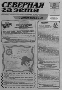 СЕВЕРНАЯ с 6 мая 2010 года ЧЕТВЕРГ ) №18(8333) С ДНЕМ ПОБЕДЫ! Основана в июне 1935 года Северная ЦБС НСО 03791563217023 УВАЖАЕМЫЕ СЕВЕРЯНЕ! ДОРОГИЕ ВЕТЕРАНЫ , ВЕЛИКОЙ ОТЕЧЕСТВЕННОЙ ВОЙНЫ 19 41 -1 9 4 5 ГГ., ВОЕННОЙ СЛУЖБЫ, СОЛДАТСКИЕ ВДОВЫ, ВДОВЫ УМЕРШИХ УЧАСТНИКОВ ВОЙНЫ, ТРУЖЕНИКИ ТЫЛА! примите самые искренние поздравления с 65-й годовщиной со Т)ня победы в ТЦеликой Отечественной войне! День Победы самый святой и радостный праздник для нашего народа! Этот праздник дорог всем россиянам, но особенно он дорог Вам, фронтовикам, совершившим ратный подвиг во имя Родины. Низкий поклон ветеранам войны, с оружием отстоявшим независимость нашей Родины, труженикам тыла, которые работали во имя Победы. Вечная память павшим героям, не вернувшимся с поля брани. Дети, внуки и правнуки фронтовиков всегда будут гордиться подвигом своих отцов и дедов разгромивших фашизм. С праздником, вас, дорогие ветераны, дорогие земляки! С уважением, Глава Северного района Новосибирской области В.Г.ИВАШКЕВИЧ; Председатель Совета депутатов Северного района Новосибирской области И.В.ЗВЫКОВ. * * * 4 ) ! Г a d * Трг 0 i m m ¿МЛ чН/ А г* Дорогие ветераны Северного района! День Победы - самый главный, светлый, торжественный праздник нашей страны нашего народа. Никогда не угаснет в памяти народный подвиг советского народа, его вооруженных сил на фронтах и в тылу. Слава им! Нами никогда не будут забыты наши соотечественники, погибшие в боях, сгинувшие в фашистских застенках, пропавшие без вести, умершие от болезней и трудовых увечий. Все они отдали свои жизни во имя Великой Победы. Вечная им память! Низкий поклон поколению победителей: фронтовикам и труженикам тыла, всем, кто внес вклад в разгром ненавистного врага, достижение Победы! С праздником Победы, 65 годовщиной Великой Победы Советского народа над фашизмом. Президиум районного Совета ветеранов войны, труда, военной службы и правоохранительных органов. Уважаемые на ветераны, дорогие земляки! От всей души поздравляем вас с б 5-летием Победы в Великой Отечественной войне! Идут годы, сменяются поколения, но, как и 65 лет назад, каждый год 9 мая мы чтим память тех, кто мужественно сражался фронтах и в партизанских отрядах, самоотверженно трудился в тылу. Они совершили этот подвиг во имя своей Родины, во имя будущего, во имя нас, во имя мирной созидательной жизни. И наша задача - свято хранить память об этом подвиге, передавать её нашим детям и внукам. 9 мая, в этот торжественный день, объединяющий людей разных поколений, давайте вспомним, каким трудным и долгим был путь к Великой Победе. Солдаты и офицеры нашей армии прошли километры фронтовых дорог, 1418 дней в кровопролитных сражениях с врагом отстаивали свободу Родины. Они пережили боль утрат и страдания, но сохранили силу духа и веру в победу, которая помогла им выстоять. Среди тех, кто сражался в Великой Отечественной войне, было много наших соотечественников - сибиряков. Везде, где им приходилось сражаться, они проявили исключительную отвагу и стойкость. Мы их прямые наследники, мы гордимся их подвигом. Великая победа имеет огромное значение для каждого из нас, она важнейшая часть национального самосознания и для многих поколений стала источником силы духа. Для нас, живущих в XXI веке, этот исторический опыт, умение сплотиться и преодолеть трудности, личная и гражданская ответственность, высокая нравстве