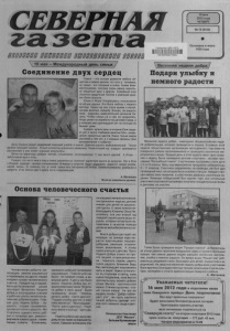 СЕВЕРНАЯ с10 мая 2012 года ЧЕТВЕРГ I №19(8438) Северная ЦБС НСО чшш : : т Основана в июне 1935 года 03749763217023 \ 15 мая - Международный день семьи / Соединение двух сердец Семья - это основа развития любого общества и самое ценное, что есть у человека, но семья - это сложные и очень тонкие взаимоотношения, поэтому очень важно научиться общаться друг с другом. Семейный очаг строится сердечным теплом и умелыми руками обоих супругов. Юлию и Игоря Топорищевых познакомили их общие друзья. Это была любовь с первого взгляда. Через год они стали мужем и женой, сыграв веселую свадьбу. Вскоре, на радость всем родилась замечательная доченька Оксана. Чтобы семья ни в чем не нуждалась, Игорь уехал на заработки на далекий Север, и в течение уже одиннадцати лет по полгода не бывает дома. Супруги купили дом, в котором Юля создает уют и тепло. Любимое занятие Юли - разведение комнатных цветов. Каких только видов растений у нее нет, и с каждым связаны свои воспоминания и события. Дочь Оксана радует родителей хорошей учебой в школе. Девочка растет любознательной. После уроков посещает кружок - Юный инспектор дорожного движения. Также второй год усердно занимается рисованием и уже имеет хорошие результаты. Юлия по характеру добрая, мягкая, отзывчивая, гостеприимная. У нее много друзей. А Игорь - заботливый муж и отец. Говорят, что часто мир и лад в семье держится на "золотом" характере одного из супругов. Вот и Юля с Игорем дорожат своими отношениями. Впереди у супругов будут трудности, радости, новые успехи, целая жизнь. И главное, что в этой семье все построено на любви, взаимопонимании, уважении и доброте. И не только друг к другу, но и к окружающим. А. Матвеева Фото из семейного архива. Основа человеческого счастья Человеческая доброта, милосердие, умение радоваться и переживать за других людей создают основу человеческого счастья. Каждый год в нашей, Больше-Куликовской школе проходит Весенняя Неделя Добра, и все учащиеся, учителя и рабочие школы являются активными добровольцами. Главная цель Недели Добра - подарить людям понимание, душевное тепло и радость. Мы старались сделать много добрых и полезных дел, демонстрировали широту души, стремление помочь ближнему, заражали добрыми примерами окружающих. Главное для нас было - не громкие слова, а реальные дела. А дел у нас было много. Неделю Добра мы открыли классным часом "Впустите добро в свои души". Были проведены акции: "Умеешь делать добро - научи другого", "Подари улыбку другим, и она к тебе вернётся", "Милосердие", "Расти - расти цветочек", "Улыбнись весне и солнцу", "Дети-Детям". Неделя добрых дел дала каждому из нас право на хороший поступок. Самыми активными стали учащиеся начальных классов, они приносили игрушки, детские книжки для детей из дошкольной группы. А также хочется поблагодарить Южанину Ольгу Николаевну, она уже второй год передаёт нашей школе вещи, игрушки, которые потом были направлены в качестве помощи детям из малообеспеченных семей. Много добрых дел ждёт нас впереди, но прежде надо вырасти настоящими людьми, добрыми, смелыми, отзывчивыми, вежливыми. А этому нужно учиться с детства. Пусть Неделя Добра станет не просто акцией, а принципом жизни - помогать людям, дарить тепло, радость ближним. Ведь без милосердия невозможно жить в мире! Нужно оглянуться по сторонам и найти, кому нужна поддержка, кому можно протяну