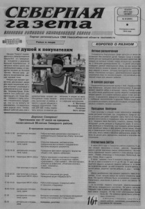 Северная ЦБС НСО Портал региональных СМИ 00198863217023 Район в лицах Новосибирской области nsonews.ru ( КОРОТКО О РАЗНОМ ) С душой к покупателям Магазин "Комета" индивидуального предпринимателя Бакуна В.И. в с. Гражданце- во пользуется у населения большой популярностью. В магазине можно купить все необходимые товары: от продуктов питания до бытовой техники. Жители села довольны ассортиментом данной торговой точки. Каждое утро магазин приветливо распахивает двери для своих покупателей, которых встречает улыбчивый и доброжелательный продавец Лопухова Ирина. В магазине она работает уже одиннадцать лет. Когда Ирина поехала в город получать специальность продавца, она ни на минуту не сомневалась, что вернется в свое родное село. Теперь каждый рабочий день она с удовольствием продает необходимый товар населению, выполняет их заявки, и просто с душой общается с каждым покупателем. Главное для нее, чтобы покупатель всегда оставался довольным, и уходил из магазина не только с покупкой, но и с хорошим настроением. А. Матвеева На снимке: Ирина Лопухова Фото автора •1111(1 II I 1.11... 1.1111.111.1.-.1111 1.,., „ I , г1М1МШ11 тнш!м1||ШШ|ГшШ|ШШ|ПМ1||М|ШШ|||||1Ш11|1^ Дорогие Северяне! Приглашаем вас 27 июля на праздник, посвященный 80-летию Северного района. В программе мероприятия: 10.00-13.30 центральная площадь села Работа выставки декоративно-прикладного и изобразительного творчества «Район талантами богат» Летние развлечения Специалисты Бергульского Дома культуры и летом не оставляют без внимания детей. Каждую среду и воскресение для них проводятся детские игровые дискотеки, на каждую из которых' готовят новую интересную программу. С большим удовольствием 1 2 - 1 3 детей регулярно посещают данные мероприятия. Ведь на них можно не только весело провести время, но и получить необходимые навыки и знания, которые пригодятся во взрослой жизни. Различные конкурсы, развлекательные задания, спортивные игры на свежем воздухе - это активный и полезный отдых для каждого ребенка. В самом разгаре Воспитатели дошкольной группы с. Коб - Кордон в этом году выпустили четырех своих воспитанников. В данный момент ведется набор в младшую группу. Сейчас силами работников дошкольной группы ведется генеральная уборка здания, а в скором времени двери снова распахнуться, и дошколята вернутся в привычный ритм жизни к любимым воспитателям и друзьям. Ребята снова смогут резвиться и играть на детской площадке, которую было решено освежить яркими красками. праздник нептина Парк культуры и отдыха снова наполнился оживленными детскими голосами, где специалисты Дома- культуры устроили для ребят праздник "День Нептуна! Ребята активно включились в подвижные игры на свежем воздухе и показали свою быстроту, ловкость, знания. Нептун загадывал детям загадки о подводном мире. В гости к ним заглянула и Купаленка, она показала детям различные лечебные травы и все дружно плели венки. Много игр и развлечений было устроено для маленьких жителей села, много смеха и веселья разносилось вокруг. Ребята на целый день зарядились энергией и хорошим настроением. 11.00-13.30 13.30- 16.30 13.30- 16.30 13.00- 20.00 13.30 17.00- 18.00 18.00- 19.00 21.00 23.00 центральная площадь села, сцена центральная площадь села, сцена территория МКУК «КДЦ» парк культуры и отдыха парк культуры и отдыха территория МКУК «КДЦ» территория МКУК «КДЦ» центральная площадь села, сцена центр