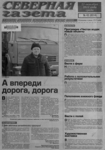 23 октября 2013 года среда Р Т Г З з (8514) | А. И. Миньков А впереди дорога, дорога В эти дни профессиональный праздник — День водителя — отмечает и Александр Миньков. Александр Иванович один из добросовестных и исполнительных сотрудников ОАО АТП «Северноеагрот- р; нс». Первая запись в его трудовой книжке была сделана более 30 лет назад, когда он пришел в колхоз «VII съезд Советов» в селе Останинка Северного района. В течение семи лет проработал здесь водителем ГАЗ-53. Трудовая биография в ОАО АТП «Северноеагротранс» для него началась после переезда в райцентр 26 лет назад. Сначала он работал на бензовозе, а через полтора года принял КамАЗ. И теперь в течение всей трудовой деятельности на этом предприятии у него одна обязанность — доставка грузов на различные объекты. Шоферская жизнь сложна. В любую погоду Александр Миньков, как и все остальные водители, отправляется в рейс, и на спидометре его КамАЗа с каждым днем увеличиваются показатели. Он спешит разгрузить кузов в месте назначения, чтобы снова отправиться за новым грузом. Как отмечает заместитель генерального директора А. А. Волошин, одно из самых главных качеств А. И. Минькова — надежность. На него можно положиться в любой ситуации. Александр Иванович за свою трудовую деятельность неоднократно награждался почетными грамотами и благодарностями районного и областного уровня. В 2012 году он был представлен к медали «За вкладе развитие Новосибирской области». А. МАТВЕЕВА. Фото автора О водителях-профессионалах, водителях-любителях и о том, что их сегодня беспокоит, читайте на стр .4 ПОЗДРАВЛЯЕМ С Днем работников автомобильного транспорта! Уважаемые работники и ветераны автомобильного транспорта Северного района! Примите искренние поздравления с профессиональным праздником! Сегодня невозможно представить свою жизнь без автомобильного транспорта. Но мы и не задумываемся о том, насколько нелегок труд водителей- профессионалов, тех, кто доставляет грузы, кто обеспечивает работу предприятий, кто трудится на пассажирском транспорте. Хорошо отлаженная ра- . бота автотранспорта — одна из составляющих бесперебойного функционирования всех сфер жизни нашего района. День работников автомобильного транспорта — это праздник водителей, рабочих, инженерно- технических работников и служащих, руководителей автотранспортных и пассажирских предприятий, преподавателей учебных заведений. В решении всех задач, стоящих перед отраслью, неоценим опыт ветеранов автомобильного и пассажирского транспорта, отдавших любимой профессии лучшие годы жизни. Уважаемые друзья! Благодарим вас за достойный труд, целеустремленность, преданность делу. От всей души желаем вам и вашим близким крепкого здоровья, счастья и благополучия, успехов в решении поставленных задач. Глава Северного района Новосибирской области В. Г. Ивашкевич Председатель Совета депутатов Северного района Новосибирской области И. В. Звыков Основана в июне 1935 года В ОБЛАСТИ Программа «Чистая вода»: новые объекты По информации областного Минстроя, по итогам года в водоснабжающую инфраструктуру региона должно быть вложено более 800 млн. рублей. В этом году по программе «Чистая вода», задача которой — обеспечить жителей области качественной питьевой водой, строится 60 километров водопроводных сетей, 4 станции водоподготовки, 14 водозаборных с