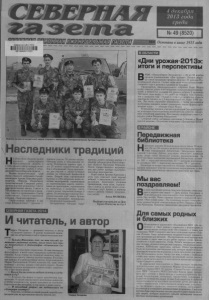В РАЙОНЕ Передвижная библиотека Военно-патриотический клуб имени старшего лейтенанта Госнаркоконтроля Артема Карелина ппппттпгп /» Северная ЦБС НСО 00196963217023 4 декабря 2013 года среда Основана в июне 1935 года В ОБЛАСТИ «Дни урожая-2013»: итоги и перспективы ВМВК «Новосибирск-Экспоцентр» с 26 по 28 ноября прошли традиционные «Дни урожая». Лучшие образцы своей продукции представляли все 30 районов Новосибирской области. Селяне подводили итоги сельскохозяй ственного года и делились планами на будущее. Председатель Законодательного собрания Иван Мороз особо отметил успех новосибирских сельхозтоваропоизводи- телей: в.непростых условиях им удалось собрать 2 миллиона 760 тысяч тонн зерна это почти на миллион тонн больше, чем в прошлом году. «Только в этом году хозяйства области приобрели техники на 2,5 миллиарда рублей, более 2000 единиц. Это очень серьезное обновление, с таким оснащением необходимо внедрять новые технологии, новые формы организации труда», — убежден Иван Мороз. В празднике приняла участие и делегация Северного района, в которую были включены руководители хозяйств, передовики уборочной кампании. Возглавлял делегацию глава Северного район Владимир Ивашкевич. Северный район награжден дипломом I степени и Малой золотой медалью «За участие в выставке «Дни урожая-2013». Наследники традиций На областном сборном пункте военного комиссариата Новосибирской области в г. Обь прошел смотр-конкурс военно-патриотических клубов и объединений Новосибирской области. Военно-патриотический клуб имени старшего лейтенанта Госнаркоконтроля Артема Карелина (руководитель Ибрагим Ульжебаев), представлявший Северный район, показал хорошие результаты: 1место ЧИ(реретягиванию каната, 3 место в соревнованиях по пейнтболу и лазар- таку, 1место в соревновании «Смотр строя и песни», 3 место в творческом конкурсе «Визитная карточка». Смотр-конкурс проходил в два - - этапа. В первом этапе -— заочном — приняли участие 53 военно-патриотических клуба и объединения области. Победители первого тура, а это 25 военно-патриотических клубов и объединений, были приглашены для участия в смотре-конкурсе команд на областной профильной смене. Второй этап соревнований включал в себя несколько видов зачетных мероприятий: соревнования по перетягиванию каната, подтягивание на перекладине,соревнования по пейнтболу и лазартаку, смотр строя и песни, творческий конкурс и другие. По итогам двух туров военно- патриотический клуб имени Артема Карелина награжден материально — технической поддержкой. Заслуженные награды будут вручены десяти лучшим клубам ! 1 декабря губернатором Новосибирской области Василием Юрченко. После торжественного награждения для ребят пройдут культурно- массовые мероприятия. Клуб имени Артема Карелина в этом году отмечает свой первый юбилей — пятилетие с момента образования. Благодаря упорным тренировкам, силе воли, стремлению к победе за время своего существования клуб принес в копилку нашего района немало заслуженных наград. Алена МАТВЕЕВА Подборка материалов ко Дню Героев Отечества на стр.4 Население деревни Новоникольск всего около 70 человек. Из них 26 человек являются постоянными читателями передвижной библиотеки. Заведующая передвижкой Светлана Зубова регулярно обновляет книжный фонд, радуя своих читателей новыми произведениями. 