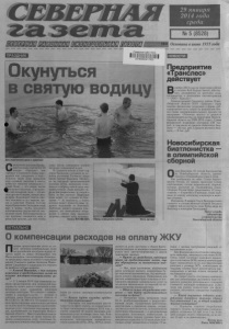 29 января 2014 года среда | № 5 (8528) | ПРАЗДНИК Окунуться т в ш ш Основана в июне 1935 года НОВОСТИ Предприятие «Транслес» действует В ноябре 2013 года на территории района в поселке Коб-Кордон начало действовать предприятие по заготовке леса, производству и реализации пиломатериалов — ООО «Транслес». Администрацией Северного района Ново- сйбирской области ООО «Транслес» была оказана финансовая поддержка в форме субсидирования части затрат на реализацию бизнес-плана предпринимательского проекта по программе «Развитие малого и среднего предпринимательства на территории Новосибирской области на 2009-2013 годы». Сумма финансовой поддержки составила 150 тыс. руб., в том числе из средств областного бюджета — 142 тыс. руб. и средств местного бюджета — 8 тыс. руб. Для укрепления духа и здоровья Священный праздник Крещения Господня отмечается 19 января. «Крещаю» или «крещу» с греческого языка переводится как «погружать в воду». Испокон веков люди предавали воде огромное значение и смысл, почти все таинства совершались с водой. Вода — это начало жизни 4Ьш о сущего на земле, а крещенс- теГя, или крещеная, вода — это начало духовной жизни, начало жизни души. Вода может помочь очистить человека от его мирских грехов и сомнений. Именно поэтому перед Крещением Господним люди идут в храмы, чтобы наполнить всевозможные сосуды святой, очищенной водой. Непосредственно в сам праздник освящается вода в реках или купелях, для того чтобы АКТУАЛЬНО люди могли совершить полное омовение освященной водой. В Северном районе в этом году обряд Крещения состоялся на соленом источнике Гостиного двора имени Артема Карелина. Несмотря на холодный пронизывающий насквозь ветер, желающих помолиться и набрать святой воды оказалось немало. Люди приходят сюда не для развлечения, а с верой в Бога, во все хорошее. Верующие люди верят, что купание на Крещение — не опасность, а благо, которое может принести даже чудесное исцеление от болезней. Любители зимнего купания утверждают, что таинственное погружение в святую воду укрепляет здоровье, очищает душу человека. Алена МАТВЕЕВА Обряд освящения купели. Фото автора Новосибирская биатлонистка — в олимпийской сборной Ольга Вилухина, 25-летняя биатлонистка из Новосибирской области, примет участие в Олимпийских играх в Сочи. Как сообщается на сайте Союза биатлонистов России, 21 января правление'Союза опубликовало состав национальной сборной, которая выступит на Олимпийских играх. Сборную России будут представлять 12 спортсменов — 6 мужчин и 6 женщин, также выбраны по одному запасному в мужскую и женскую сборные. Напомним, 8 января Ольга Вилухина взяла «золото» в составе женской сборной России в эстафете 4x6 км на пятом этапе Кубка мира по биатлону в немецком Рупольдинге. Пресс-служба губернатора и правительства Новосибирской области О компенсации расходов на оплату ЖКУ Порядок предоставления льгот по оплате жилищно-коммунальных услуг на протяжении последних недель остается одной из самых обсуждаемых тем. Мы встретились с исполняющим обязанности начальника отдела пособий и социальных выплат Северного района Алексеем Ивановичем Сандзюком и попросили его ответить на наиболее острые вопросы. — Алексей Иванович, с чем связаны изменения в предоставлении льгот по оплате жилищно-коммунальных услуг? — С 1 января 2014 года изменился пор