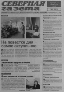 5февраля 2014 года среда 1Г"" №6 (8529) | Основана в июне 1935 года ДНИ ГЛАВЫ НОВОСТИ ИЗ ДЕТСКОЙ БИБЛИОТЕКИ Встреча главы Северного района Владимира Ивашкевича в селе Федоровке. ...и в селе Остяцке На повестке дня - самое актуальное В период с 16 по 23 января в ходе рабочих поездок глава района Владимир Григорьевич Ивашкевич побывал в селах Новотроицке, Федоровке, Останинке, Остяцке и д. ¿фгудь, где посетил все учреждения и РргЖизации, имеющиеся на территориях. В каждом населенном пункте прошли встречи главы района с жителями, которые обратились с наболевшими проблемами. Основными из них были: автобусное сообщение, медицинское обеспечение, бытовое обслуживание, водоснабжение, отсутствие сотовой и интернет-связи, проблема за готовки дров. Многие участники встречи высказывали свою точку зрения относительно жизнедеятельности своего села и района. В. И. Ивашкевичу понравилось неравнодушие людей,’и в решении большинства вопросов в ближайшее время он обещал оказать содействие. Каждая рабочая поездка завершалась приемом граждан по личным вопросам и консультированием по правовым вопросам специалистом-юристом администрации района. Все поднятые вопросы гражданами и руководителями учреждений взяты главой на контроль. Информация о ходе и результатах решения поднятых вопросов будет доведена до жителей района через средства массовой информации в течение февраля-марта текущего года. В ОБЛАСТИ Заботимся о здоровье вместе Ведущие медицинские специалисты посетят районы Новосибирской области и проведут консультации для населения В 2014 году в Новосибирской области будет реализован проект «З а ботимся о здоровье вместе!». Его суть — приблизить возможности специализированной медицинской помощи к жителям районов, пояснил министр здравоохранения Леонид Шаплыгин. Проект предполагает организацию регулярных выездов в районы Новосибирской области сотрудников ведущих медицинских учреждений (федеральных и региональных), представителей СО РАМН, НЕМУ для обследования населения, обучения врачей. Будут проводиться лекции с населением, страдающими сахарным диабетом,гипертонией и другими болезнями, а также профилактические беседы с молодежью. Главной площадкой для осмотров станут центральные районные больницы. Пресс-служба губернатора и правительства Новосибирской области РАЙОН В ЛИЦАХ Ответственная и исполнительная В коллективе ОАО «Новосибирскавтодор» филиал Барабинского ДРСУ «Северный участок содержания автомобильных дорог», состоящем из 52 человек, работают всего четыре женщины. Одна из них, Татьяна Алексеевна Тарасова, на предприятии работает уже более 17 лет, последние семь лет — в качестве мастера дорожного участка. Должность у Татьяны Алексеевны одна из самых ответственных, потому что она непосредственно отвечает за обеспечение круглосуточного проезда на дорогах района. График работы у мастера участка ненормированный. Часто приходится задерживаться на работе до ночи, ведь необходимо вовремя выпустить технику на дорогу и доледаться ее возвращения. Но Татьяна Алексеевна, обладая такими качествами, как исполнительность, ответственность, умение налаживать контакт с людьми, разными по характеру, по отношению к делу, все трудные рабочие моменты преодолевает с легкостью. За многолетний добросовестный труд Татьяна Алексеевна имеет н
