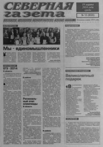 СЕВЕРНАЯ г аз е та 19 марта 2014 года среда | № 12 (8535) | Основана в июне 1935 года ВОЛОНТЕРСТВО Участники круглого стола «Принцип открытости» Мы - единомышленники ■^^онкурс публич- ных отчетов об- ^Щ^щественных организаций , клубных объединений, органов школьного и территориального общественного самоуправления в нашем районе проходит во второй раз. Если в 2013 году в нем приняло участие шесть организаций, то в нынешнем году — уже четырнадцать. Такой рост числа участников закономерен: увеличивается количество общественных объединений, развивается творческий потенциал наших граждан, расширяется спектр их деятельности. Люди ищут единомышленников, находят их и объединяются для решения социально значимых задач. Раиса АКИЛИНА (Окончание на стр.2) ОБРАЗОВАНИЕ Е ГЭ -2014 В области Предварительные заявки на ЕГЭ-2014 подали около 14 тысяч новосибирских школьников. В тройку наиболее популярных среди школьников экзаменов по выбору попали об- ществознание, физика и исто- ф Об этом на брифинге рас- (Жзал заместитель министра образования, науки и инновационной политики Новосибирской области Дмитрий Метелкин. Напомним, 1 марта завершился срок подачи заявлений на участие в ЕГЭ 2014 года. К этому времени все кто планирует сдавать госэкзамен, должны были определиться со списком выпускных испытаний по выбору. Единый государственный экзамен в 2014 году предполагают сдавать 14 149 человек (13 806 выпускников общеобразовательных учреждений' текущего года и 252 выпускника прошлых лет). В рамках брифинга Дмитрий Метелкин подчеркнул, что в 2014 году выпускники стали выбирать больше предметов для сдачи ЕГЭ, то есть на одного человека, помимо двух обязательных экзаменов (русский язык и математика), приходится большее количество экзаменов. «По-прежнему в качестве третьего экзамена лидирует обществознание. В2014 году о своем желании сдать этот предмет в форме ЕГЭ заявили 9 111 выпускников. На втором месте —физика. О своей готовности сдать ее заявили 3 255 человек. На третьем месте история —3178 человек», — сказал Дмитрий Метелкин. Далее по количеству заявлений следуют: биология —ее предполагают сдавать 2722 выпускника, информатика и ИКТ —2180 человек, химия — 1411, английский язык —1341, география — 725 человек, литература — 721, немецкий язык — 58 человек, французский язык —37 человек. Пресс-служба губернатора и правительства Новосибирской области В районе В Северном районе в 2013 году из образовательных учреждений выпускаются 68 человек, зарегистрированы на экзамены в форме ЕГЭ — 67. Ими поданы заявления на сдачу 251 экзамена. Самыми популярными, кроме математики и русского языка, являются: обществознание —44 выпускника, биология —24, история — 16, физика — 11, информатика и ИКТ —7. Региональный этап олимпиады В области Более 480 школьников региона стали победителями и призерами регионального этапа Всероссийской олимпиады школьников Всего в региональном этапе Всероссийской олимпиады школьников приняли участие 2014 учащихся 9-11 классов Новосибирской области, которые стали победителями и призерами муниципальных этапов. Среди участников олимпиады 1049 школьников представляли город Новосибирск, 742 школьника — районы области. Еще 223 школьника из регионов Сибири входили в команду Специального учебного центра НГУ. Для сравнения: в 2013 г. участниками олимпиады стали 2064 человека. В течение четырех недель