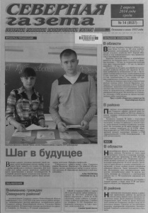 2 апреля 2014 года среда Шаг в будущее Анастасия Данилова и Алексеи Чалков, жители Северного района, студенты СХТ Куйбышевский В жизни каждого человека наступает такой момент, когда необходимо сделать выбор, от которого будет зависеть его судьба, его будущее, —выбор профессии и учебного заведения. Для того чтобы этот выбор сделать правильно, необходимо иметь представления о разных специальностях. В Северной средней школе специалистами Центра занятости населения Северного района была организована ежегодная «Ярмарка профессий». Собравшихся приветствовал глава Северного района Владимир Ивашкевич. Он пожелал обучающимся сделать правильный выбор и после получения диплома об образовании вернуться в свой родной район. Алёна МАТВЕЕВА (Окончание на стр. 2) О Б Ъ Я В Л Е Н И Я Вниманию граждан Северного района! Администрация Северного района Новосибирской области информирует, что с 31.03.2014 года приступила к работе нотариус, занимающийся частной практикой, нотариального округа Северного района Новосибирской области, Схоменко Ирина Александровна. Нотариальная контора расположена по адресу: с. Северное, ул. Ленина, д. 25 (здание универмага). МКОУ «Северная СОШ» с 1марта 2014 года объявляет набор первоклассников на 2014-2015 учебный год. Прием документов с 10-00 до 15-00 ежедневно, кроме субботы и воскресенья, в кабинете директора. Справки по телефону: 21-532. Подробная информация размещена на сайте шко- лы:8_8гебп.sev.edu54.ru Администрация школы Я Р М А Р К А П Р О Ф Е С С И Й С Е Л Ь С К О Е Х О З Я Й С Т В О В области В2014 году посевные площади в области составят более 2,4 млн. га. Об этом сообщил временно исполняющий обязанности министра сельского хозяйства НСО Георгий Ива щенко в ходе информационного часа правительства в Заксобрании региона. Зерновые (включая озимые) и зернобобовые разместят на площади около 1,6 млн. га, кормовые культуры —745 тыс. га, технические культуры (лен, рапс, подсолнечник) —81 тыс. га, овощи и картофель —43 тыс. га. По данным на 26 марта, для обработки сельхозугодий хозяйства области уже закупили 16 тыс. тонн удобрений из необходимых 32 тыс. т. На весенне-полевых работах будет задействовано более 11 тыс. тракторов, 5,6 тыс. грузовых автомобилей, 3,2 тыс. культиваторов, 6,7 тыс. сеялок, 527 единиц современных посевных комплексов. Отвечая на вопросы депутатов о перспективах весенне-полевых работ, Георгий Иващенко подчеркнул, что посевная кампания в 2014 году будет осложнена природно-климатическими особенностями двух последних лет, наложившими отпечаток на экономическую стабильность сельхозпроизводителей региона. Но несмотря на сложности, ситуация в АПК региона на период весенне- полевых работ управляемая. Пресс-служба губернатора и правительства Новосибирской области В районе По данным сельхозуправления администрации Северного района, согласно плану весенне-полевых работ на 2014 год, общая посевная площадь сельскохозяйственных культу составит 7419 га. Готовность техники. В связи с отсутствием отапливаемых мастерских и специалистов (механизаторов), которые не работают в зимний период, сроки ремонта техники в хозяйствах затягиваются. По состоянию на 26 марта процент готовности техники колеблется от 10 (СПК «Верх- Красноярский») до 100% (ООО «Борьба за мир»), высокий процент подготовки техники в СПК «Гражданцевский» и СПК «Новотроицкий» —90 и 80 соответственно. Ж К 