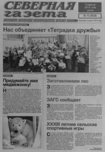 СЕВЕРНАЯ 9 апреля 2014 года среда ю сл "оо Сс Ло оо Основана в июне 1935 года Нас объединяет «Тетрадка дружбы» Участники Школы кураторов Всероссийской программы «Тетрадка дружбы: В Северном районе дан старт Всероссийской программы развития молодёжных социальных инициатив и школьного добровольчества «Тетрадка дружбы». «Северная газета» будет освещать реализацию программы и выступает спонсором в одной из номинаций — «Моя первая книга». Победитель в этой номинации получит специальный приз от редакции. Подробнее о мероприятии читайте на стр. 4. КОНКУРС щновости Придумайте имя медвежонку! Новосибирский зоопарк вновь привлек к себе внимание не только нашей области, но и всей страны. На этот раз поводом стало рождение у белых медведей Кая и Герды очаровательного малыша. В неволе эти животные размножаются крайне редко. В течение трех месяцев медведица не покидала своей берлоги, и сотрудники зоопарка могли наблюдать за новорожденным только через видеокамеры. К счастью, Герда оказалась очень ответственной мамой, она с нежностью ухаживает за малышкой (как выяснилось, новорожденная —девочка). Сейчас медведица уже вывела свое потомство в вольер, и все желающие могут увидеть эту очаровательную пару. В Интернете появилось огромное количество снимков медвежьей семьи. Администрация зоопарка объявила конкурс на лучшее имя малышке. Уважаемые читатели, редакция «Северной газеты» предлагает вам принять участие в этом конкурсе. Мы ждем ваших звонков с 10 по 16 апреля с 9-00 до 17-00 по телефонам редакции: 21-984, 21-875. Самые интересные предложения будут отмечены оригинальными призами и отправлены для участия в конкурсе на сайт зоопарка. Заготавливаем лес За первый квартал 2014 года ОАО «Северный лесхоз» заготовил леса в количестве 8487 кубометров, из них хвойного —816 кубометров, лиственного —7671. Более 3000 кубометров леса вывезено за базу предприятия для дальнейшей переработки. По сравнению с аналогичным периодом 2013 года произошло увеличение на 120 %. Также «Северный лесхоз» занимался услугами по обеспечению льготной категории населения дровами колотыми. За три месяца текущего года потребителям было доставлено дров в количестве 4504 кубометра. Предприятие занимается и другими видами услуг, в том числе укладкой лежневых оснований для «Новосибирскнефтегаза». ЗАГС сообщает За три месяца текущего года в Северном районе родились 26 малышей, этой на одного меньше, чем за аналогичный период прошлого года. Наибольшее число женщин стали мамами в возрасте от 21 до 30 лет. Восемь семей стали счастливыми родителями впервые, в 12 семьях на свет появился второй ребенок, в 6 — третий. Самыми популярными именами новорожденных стали Артём, Кирилл, Елизавета, Алина. Из редких имен —Тимур, Назар, Родион, Ульяна, Софья, София. Внебрачных детей зарегистрировано трое. За три месяца 2014 года узаконили свои отношения лишь шесть пар, это почти вдвое меньше, чем за аналогичный период прошлого года. А вот расторжений брака отделом ЗАГС Северного района зарегистрировано на семь меньше — разорвать свои отношения решили шесть супружеских пар. В районе за текущий период умерли 38 человек, это на 4 человека больше, чем в прошлом году. XXXIII летние сельские спортивные игры С 21 марта стартовали XXXIII летние сельские спортивные игры Новосибирской области. Все районы по численности населения раздел