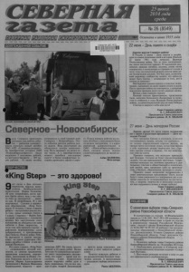 25 июня 2014 года среда I № 26 (8549) | Основана в июне 1935 года Посадка пассажиров в новый автобус ДОЛГОЖДАННОЕ СОБЫТИЕ Северное-Новосибирск В селе Северном произошло значимое для района событие — районная администрация передала новый автобус ОАО АТП «Северноеагротранс», на приобретение которого ОАО «Новосибирскнефтегаз» было выделено 3 миллиона рублей, из местного бюджета — 300 тысяч рублей. 18 июня автобус отправился в свой первый рейс Северное — Новосибирск. Этого события жители района долго ждали. Ведь расстояние до областного центра немаленькое. Путь занимает не менее семи часов. А с приобретением нового автобуса пассажиры смогут в более комфортных условиях проводить время в дороге. Перед первым рейсом на новом автобусе у пассажиров было отличное настроение, и в адрес районной администрации и ОАО «Новосибирскнефтегаз» было сказано много теплых слов благодарности за такой подарок. Алёна МАТВЕЕВА Фото автора ТВОРЧЕСТВО т «King Step» - это здорово! Кружковое объединение «King Step» и его руководитель Мария Александровна Халюкова лет назад в Дом детского творчества пришла выпускница Куйбышевского педколледжа Мария Халюкова. «Я хочу попробовать вести кружок брейк-данса, ведь у нас никто этим не занимается!» —заявила она. И попробовала. И у нее получилось! Сегодня в кружковом объединении «King Step» около 15 человек. Самые старшие ребята —выпускники школы этого года, самые младшие учатся в 5 классе. Старожил —Вадим Зуев, который занимается с основания кружка. Без выступления этого коллектива не обходится ни одно событие в Доме творчества, в этом году они приняли участие в районных мероприятиях: слете добровольцев, в праздновании Дня Победы, Неделе добра. Ребята выезжали и давали мастер- класс на школе кураторов «Тетрадка дружбы» в Биазе и для молодежи Витинска. Но самое главное, «King Step» — сложившийся детский коллектив, со своими традициями, правилами поведения, сюрпризами, чаепитиями за общим столом. Огромная заслуга в этом педагогов: Марии Александровны Халюковой и Марины Ивановны Кыштымовой, педагога — организатора ДДТ. Но очень многое зависит и от самих ребят. Вадим Зуев как-то совершенно незаметно умеет поддерживать дисциплину, его слово — закон для остальных. Саше Коростелеву можно поручить любое дело и быть уверенным, что он все сделает в срок. Андрей Долоницкий — просто душа компании, для каждого у него найдется доброе слово. Хочется пожелать ребятам и их руководителям больших творческих успехов. А выпускникам —успешного выбора жизненного пути. Раиса АКИЛИНА 22 июня - День памяти и скорби Дорогие жители Северного района! В России 22 июня —День памяти и скорби, один из самых печальныхдней в истории. Именно 22 июня 1941 года началась Великая Отечественная война. Что за этим последовало, мы знаем достаточно хорошо: 30 миллионов российских граждан погибло, десятки, сотни тысяч содержались в концлагерях и страдали от голода в тылу, годы послевоенной разрухи унесли свою долю человеческих жизней. Это был урок, позволивший мировому сообществу понять, что война не может быть благом — независимо от того, кто и почему ее начинает. Мы бережно храним память о тяжелых испытаниях, выпавших на долю наших отцов и дедов. Пусть трагедия войны не повторится, а грядущие поколения превыше всего ценят мирную жизнь. Вечная слава павшим героям! Низкий поклон 