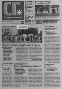 ПОГОДА____ Еж ен ед ел ь н ая г а з е т а С е в е р н о го р айон а . О с н о в а н а в ию н е 1 9 3 5 год а 20 августа 2014 г. Среда, № 34 (8557) 21 августа Ночью: +11 . Днем: +20 . Ясно. Ветер восточный, 1 м/с 22 августа Ночью: + 1 4 . Днем: + 2 2 . Ясно. Ветер северный, 1 м/с 23 августа Ночью: + 1 3 . Днем: + 2 3 . Облачно. Ветер южный, 2 м/с 24 августа Ночью: + 1 4 . Днем: + 2 4 . Ясно. Ветер южный, 2 м/с 25 августа Ночью: + 1 6 . Днем: + 2 5 . Ясно. Ветер юго-восточный, 2 м/с 26 августа Ночью: + 1 6 . Днем: + 2 5 . Ясно. Ветер южный, 3 м/с 27 августа Ночью: + 1 8 . Днем: + 2 6 . Ясно. Ветер южный, 2 м/с Мы верим твёрдо в героев спорта! О мероприятиях, посвященных Дню физкультурника, чествовании ветеранов спорта Северного района читайте на стр. Д. ЦИФРА НОМЕРА_________________________ * квадратный метра — размер флага России, развернутого на праздновании Дня России в 2014 году. Этот факт зафиксирован в российской «Книге рекордов и достижений» Здесь наши глубокие корни Под таким названием в минувшую субботу прошла встреча земляков Северного района. На праздник ^приехали представители ^/»сех наших поселений, пгости из Новосибирска, Куйбышева, Барнаула. Присутствующих приветствовали исполняющий обязанности главы района Сергей Юрьевич Дмитриев, почетный гражданин Северного района Анатолий Валентинович Петров. С музыкальным приветом к землякам обратились супруги Галина и Александр Бакун, начинавшие свою трудовую и творческую деятельность в нашем районе, а сегодня проживающие в Коченево. Заслуженные труженики, внесшие значительный вклад в развитие Северного района, были награждены почетными грамотами главы. К празднику было приурочено торжественное вручение памятных медалей к 25- летию вывода советских войск из Афганистана нашим землякам, с честью исполнившим свой интернациональный долг. Порадовали гостей праздника выступления самодеятельных артистов, участников районного фестиваля народного творчества «Играй и пой, душа сибирская!». Много зрителей собрала фотовыставка «Мои замечательные земляки». Северяне смотрели на фотографии, вспоминали, обсуждали. Вэтот день в районной библиотеке прошли краеведческие чтения «Знаем, помним, гордимся», на которых были представлены выступления об истории нашей малой родины и судьбах земляков. Завершили праздник гости из Новосибирска — Государственный ансамбль песни и танца «Чалдоны». Более подробно о праздничных мероприятиях читайте в следующем номере «Северной газеты». ВОПРОС-ОТВЕТ Это важно знать Читатели «Северной газеты» интересуются: что влияет на размер пенсии? По этому вопросу мы попросили дать разъяснения начальника Управления пенсионного фонда в Северном районе Ольгу ЗЫКОВУ: —Главными параметрами, которые влияют на размер страховой пенсии, являются, в первую очередь, размер заработной платы и длительность страхового стажа. Чем больше заработная плата и стаж, тем больше страховая пенсия. Минимальный стаж, требуемый по действующему законодательству, — это пять лет. С 1 января 2015 года минимальный стаж поэтапно будет увеличиваться по 1 году в год, с 6 лет в 2015 году и до 15 лет в 2024 году. 22 августа — День российского флага День флага России по праву считается тем праздником, который объединяет многих людей, напоминая в то же время о важных и постоянных ценностях, среди которых вечными являются государственность и патриотизм населения. 22 августа 1991 года над Белым домом в Москве впервы