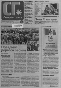 ж Северная газета Еженедельная газета Северного района. Основана в июне 1935 года 3 сентября 2014 г. Среда, № 36 (8559) П О Г О Д А * 4 сентября Ночью: + 1 0 . Днем : + 1 5 . Облачно, небольшой дождь . Ветер северо -западный , 2 м /с 5 сентября Ночью: + 0 . Днем : + 1 6 . Пасмурно , небольшой дождь. Ветер ю го -западный , 2 м /с 6 сентября Ночью: + 1 0 . Днем : + 1 9 . Малооблачно . Ветер ю го - западный , 4 м /с 7 сентября Ночью: + 1 0 . Днем : + 1 0 . Ясно. Ветер западный , 3 м /с 0 сентября Ночью: + 1 2 . Днем : + 1 7 . Малооблачно , небольшой дождь . Ветер западный , 9 сентября Ночью: + 1 2 . Днем : + 2 0 . Малооблачно , небольшой дождь . Ветер южный , 2 м /с 1 0 сентября Ночью: + 1 2 . Днем : + 2 2 . Ясно. Ветер южный , 2 м /с Дата в истории района 7 сентября — День работников нефтяной, газовой и топливной промышленности. Об истории нефтедобычи в Северном районе читайте на стр. 5 Ц И Ф Р А Н О М Е Р А 1 млрд. 3 млн. рублей затрачено на проведение ремонтных работ в летний период 2 0 1 4 года в образовательных учреждениях Новосибирской области Д Е Н Ь З Н А Н И Й БС НСО 0 3 7 9 6 9 6 3 2 1 7 0 2 3 Праздник первого звонка Алёна МАТВЕЕВА ■ Вот и настал самый “ долгожданный день для тех, кто впервые переступил школьный порог. Наши первоклассники, совсем еще недавно посещавшие детские сады, вступают в совершенно новую жизнь. Поэтому 1 сентября для них —самый волнующий и запоминающийся день. Праздник первого звонка —- это праздник и для тех, кто не впервые сядет за парту, кто сделает очередной шаг по длинной, необычно интересной, полной новых открытий дороге знаний. В Северном районе во всех школах прошли торжественные линейки. В Северной школе со словами поздравлений и теплых пожеланий ученикам и педагогам П О З Д Р А В Л Я Е М ! * выступили глава Северного района Владимир Григорьевич Ивашкевич, депутаты Законодательного собрания Новосибирской области, представляющие интересы Северного района, Юрий Николаевич Шпаков и Владимир Васильевич Лаптев. С добрыми напутствиями на новый учебный год к ребятам обратились директор школы Н. М. Виноградова, замдиректора A. В. Коновалова, классный руководитель выпускного класса А. Г. Люст и другие. От депутатов Ю. Н. Шпакова и B. В. Лаптева и политической партии «Единая Россия» первоклассникам были вручены подарки. Вновь наполнились шумными и радостными голосами светлые кабинеты школ. В этот день мы строим новые планы, мечтаем о новых открытиях и достижениях в мире знаний, с нетерпением ждем новых друзей и знакомых. Звучит первый звонок! Для справки. В системе образования Новосибирской области функционирует 1029 школ, 702 дошкольных учреждения, 126 организаций дополнительного образования. В новом учебном году за парты сядут около 28,7 тыс. первоклассников. Всего в школах будут обучаться более 275 тыс. детей и работать более 24 тыс. педагогов. В детских садах будет воспитываться более 117,5 тыс. детей. В Северном районе на 1 сентября функционирует 15 образовательных учреждений (Среднеичи- нская основная школа находится в стадии реорганизации путем присоединения к Новотроицкой основной школе), 4 из которых средние и 11 —основные. В них обучаются 1065 детей. В первый класс в нынешнем году пойдут 142 ребенка. В районе работает два учреждения дополнительного и два дошкольного образования. Дорогие северяне! Примите искренние поздравления с 1 сентября — Днем знаний! Можно смело утверждать, что этот день —праздник не только для педагогов и у