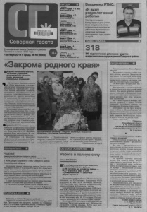 Северная газета Еженедельная газета Северного района. Основана в июне 1 9 3 5 года 1 октября 2014 г. Среда, № 40 (8563) П О Г О Д А * 2 октября Ночью: + 5 . Днем: + 1 3 . Ясно. Ветер южный, 5 м/с 3 октября Ночью: + 8 . Днем: + 1 1 . Небольшой дождь. Ветер южный, 6 м/с 4 октября Ночью: + 4 . Днем: + 9 . Небольшой дождь. Ветер западный, 1 м/с 5 октября Ночью: + 2 . Днем: + 5 . Небольшой дождь. Ветер восточный, 5 м/с Б октября Ночью: + 1 . Днем: + 4 . Небольшой дождь. Ветер юго-западный, 3 м/с 7 октября Ночью: 0. Днем: + 3 . Небольшой дождь. Ветер восточный, 3 м/с 8 октября Ночью: -1 . Днем :+2. Облачно, дождь. Ветер юго-западный, 3 м/с Владимир ЯТИС: «Я вижу результат своей работы» 5 октября отмечается Международный день учителя. Слова поздравлений, любви и признательности педагогам, работникам образовательных учреждений, ветеранам педагогического труда читайте на стр. 5 Ц И Ф Р А Н ОМ Е Р А * 318 318 педагогических работников трудятся в образовательных учреждениях Северного района «Закрома родного края» Верх-Красноярское поселение — победитель в номинации «За красочное оформление». Фото Николая Подскребышева ■ Марина Витальевна Войнова, "начальник управления экономического развития, труда, имущества и земельных отношений: —К участию в «Закромах родного ая» были привлечены сельскохозяйственные товаропроизводители, крестьянские (фермерские) хозяйства, личные подсобные хозяйства, предприятия потребительской кооперации, перерабатывающей промышленности, жители, всего более 20 участников. К сожалению, это меньше, чем в предыдущие годы. Хочу выразить благодарность детскому саду «Улыбка», единственному из организаций райцентра, за постоянное участие в мероприятии. Ассортимент продукции был широкий, цены доступные. Так, Северный маслозавод на свою продукцию предоставлял скидку в размере 20%. Жюри познакомилось со всеми участниками и определило победителей, которым глава Северного района С. В. Коростелёв вручил дипломы ^денежные премии. V Победителем в номинации «За разнообразие ассортимента» стало ДОАО «Северное хлебоприемное предприятие» (руководитель А. Н. Бирюков), которым было представлено 44 наименования выпускаемой продукции. В номинации «За красочное оформление» лучшим признан Верх- Красноярский сельсовет (глава С. А. Клещенко), а в номинации «За ориО Ф И Ц И А Л Ь Н О РЕШЕНИЕ гинальность» — Гражданневский сельсовет (глава В. И. Закамский). От имени администрации Северного района выражаю благодарность всем, кто принял участие в празднике «Закрома родного края» и надеюсь на дальнейшее сотрудничество. (Продолжение на стр.4) П О ЗД Р А В Л Я ЕМ * Уважаемые жители Новосибирской области! Традиционно в начале октября в нашем регионе проходит Декада пожилых людей. Это еще один повод привлечь внимание всего общества к проблемам людей старшего поколения, оказать им дополнительную поддержку. От всей души поздравляем вас с Днем пожилого человека! Этот праздник —символ единства и преемственности поколений, связи времен. Вы щедро делитесь с молодежью знаниями и бесценным опытом, своим примером воспитываете у юных жителей силу духа, трудолюбие, патриотизм. Вы —наша гордость и опора, хранители мудрости и наших лучших традиций, достойный пример для подражания будущим поколениям. Благодарим вас за труд, искреннюю любовь к Новосибирской области и большой вклад в ее развитие. От чистого сердца желаем вам крепког