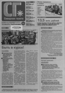 Еженедельная газета Северного района. Основана в июне 1 9 3 5 года 15 октября 2014 г. Среда, № 42 (8565) ПОГОДА * 1 6 октября Ночью: -2 . Днем: -1 . Снег. Ветер западный, 2 м /с 17 октября Ночью: -6 . Днем: -2 . Малооблачно. Ветер западный, 3 м /с 1 8 октября Ночью: -5 . Днем: -2 . Снег. Ветер восточный, 3 м /с 19 октября Ночью: -а . Днем: -2 . Пасмурно, снег. Ветер восточный, 5 м /с 20 октября Ночью: -1 . Днем: + 3 . Пасмурно, небольшой дождь. Ветер западный, 3 м /с 21 октября Ночью: + 4 . Днем: + 8 . Облачно, небольшой дождь. Ветер южный, 3 м /с 22 октября Ночью: + 2 . День: 0. Пасмурно, небольшой снег. Ветер юго-западный, 6 м /с Жизнь прекрасна в любом возрасте О Декаде мудрых, энергичных, жизнерадостных, красивых, любящих жизнь читайте на стр. 4 ЦИФРА НОМЕРА 13,5 млн. рублей С начала года более 1 3 ,5 млн . рублей из областного бюджета направлено на адресною социальную помощь жителям Новосибирской области ПРОЕКТ * :аия вдшбго успеха Северная ЦБС НСО 03797563217023 Презентация проекта «Открытый университет Сибири», выступает Светлана Тарасова, директор НГОНБ Быть в курсе! Раиса АКИЛИНА ■ У ч р еж д е н и я культуры " н а ш е г о района, в том числе и Центральная библиотечная система , в последние годы добиваются а значительных успехов и на региональном уровне. Библиотекари неоднократно становились победителями областных профессиональных конкурсов , завоевывали «золото» на Культурной олимпиаде НСО, участвуют в различных проектах , активно сотрудничают с областными учреждениями культуры. На прошедшей неделе в Северной ЦБС был представлен культурно-образовательный проект Новосибирской государственной областной научной библиотеки «Открытый университет Сибири», девиз которого — «Образование не на всю жизнь, а через всю жизнь». Этот пилотный проект осуществляется при финансовой поддержке Министерства культуры и благотворительного фонда Михаила Прохорова и рассчитан на люП О Д П И С К А - 2 0 1 5 дей всех возрастов. Наряду с Северной библиотекой в нем участвуют всего 4 учреждения области этого профиля. Отрывая презентацию, Александра Бабикова, менеджер НГОНБ, рассказала об основных целях и направлениях проекта. Учебный курс представляет собой комплексную программу из 5 тематических модулей: «Быть в курсе!» — практический курс по информационной грамотности и правовому образованию. «По странам иконтинентам» —краеведение, история, культура, достопримечательности. «Языки мира: общение без границ» — иностранные языки, повышение грамотности русскоговорящего населения. «Об искусстве —просто» — о театре, кино, музыке, живописи доступно и просто. «Экология личности и здоровье» — о физическом, психоэмоциональном здоровье человека. Программа предполагает различные формы работы: лекции, онлайн-консультации, трансляции, видеоуроки, мастер-классы, вебинары, экскурсии. Обучение с октября по апрель. Партнерами проекта станут музеи, концертные организации, библиотеки, общественные организации Новосибирска. Далее к присутствующим обратилась Светлана Антоновна Тарасова, директор НГОНБ: — Новосибирск давно признан культурной столицей Сибири, он имеет огромный спектр культурных мероприятий для любой аудитории. Но чем дальше от областного центра, тем этот спектр становится меньше. Наш проект, использование информационных технологий дадут возможность жителям отдаленных районов, в том числе Северного, поучаствовать в ра