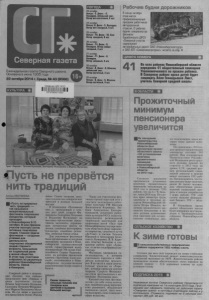 Еженедельная газета Северного района. Основана в июне 1935 года 22 октября 2014 г. Среда, № 43 (8566) ПО ГОДА * 23 октября Ночью: -3. Днем: + 2 . Пасмурно, небольшой снег. Ветер юго-восточный, 2 м/с 24 октября Ночью: 0. Днем: -5 . Пасмурно. Ветер юго-западный, 6 м/с 25 октября Ночью: -1П. Днем: -10 . Снег. Ветер западный, 6 м/с 2Б октября Ночью: -14 . Днем: -9. Пасмурно. Ветер северо- западный, 3 м/с 27 октября Ночью: -11. Днем: -8. Пасмурно. Ветер западный, 3 м/с 28 октября Ночью: -8. Днем: -5 . Облачно, небольшой снег. Ветер восточный, 3 м/с 29 октября Ночью: -6 . День: -5 . Облачно. Ветер восточный, 4 м/с Рабочие будни дорожников В конце октября отмечается профессиональный праздник работников автодорожной отрасли. О рабочих буднях специалистов филиала Барабинского ДРСУ «Северный участок содержания автомобильных дорог» ОАО «Новосибирскавтодор» и ОАО АТП «Северноеагротранс» читайте на стр. 4 Ц И Ф Р А Н О М Е Р А У Ё Л Во всех районах Новосибирской области ь ф | определен 41 общественный помощник Уполномоченного по правам ребенка. В Северном районе права детей будет защищать Алла Геннадьевна Люст, учитель Северной средней школы К У Л Ь Т У Р А ЗЕ Северная ЦБС НСО 03797663217023 Лусть не прервётся нить тредиций Алёна МАТВЕЕВА ■ «Пусть не прервется ^нить традиций» — так назывался межрегиональный фестиваль творческих инициатив, который проходил в Новосибирске 9-10 октября. В нем приняли участие полторы сотни активных творческих людей. Главная задача фестиваля — создание условий для деятельности творческих объединений людей старшего возраста, повышение их социальной роли в жизни общества. В этом году участники собрались из различных районов Новосибирской области, Омска и Кемерово. жива». Своим талантом, сильным голосом они покорили всех зрителей и вызвали большой восторг. В номинации «Половинка моя...», проходившей в течение двух дней, супруги Фи- нашкины Екатерина Петровна и Владимир Васильевич на выставке-презентации представили экспонаты, отражающие интересные факты их жизни: семейные фотографии, ‘рукоделие, семейные реликвии, любимые блюда семьи. Для участников фестиваля была организована культурная программа: экскурсия в Новосибирский художественный музей, торжественный вечер, посвященный 700-летию Преподобного Сергея Радонежского, на котором прозвучала кантата «Заступник земли русской», состоявшийся в Новосибирском государственном академическом театре оперы и балета. Также для участников фестиваля прошел круглый стол с участием заслуженного работника культуры РФ Виктора Васильевича Коровина, Любови Алексеевны Екатери- нушкиной, почетного работника культуры НСО, педагога- консультанта региональной творческой мастерской для одаренных детей «Лад» при Новосибирском государственном областном Доме народного творчества, семейного дуэта «Де’Сант» в составе Татьяны Юрьевой и Александра Болотова (г. Кемерово). В. В. Коровин отметил большую и слаженную работу трио «Лирика», отлично подобранный репертуар. Фестиваль завершился гала-концертом, в котором участвовали лауреаты и победители конкурсных просмотров. Вих числе и наши замечательные землячки из «Лирики», которые привезли диплом Б О БЛ А С ТИ * Прожиточный минимум пенсионера увеличится лат пенсионерам, доход которых ниже данной величины. По сравнению с 2014 годом прирост прожиточного минимума составит 545 рублей. При планируемом Прав