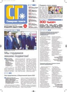 ПОГОДА Северная газета 23 апреля Ночью: +4. Днем: +8. Пасмурно, дождь. Ветер северный, 3 м/с 24 апреля Ночью: +1. Днем: +12. Пасмурно, небольшой дождь. Ветер юго-западный, 5 м/с 25 апреля Ночью: +4. Днем: +15. Пасмурно. Ветер юго-западный, 8 м/с 26 апреля Ночью: +6. Днем: +12. Малооблачно, небольшой дождь. Ветер западный, 4 м/с 27 апреля Ночью: +2. Днем: +9. Малооблачно, небольшой дождь. Ветер юго-западный, 5 м/с 28 апреля Ночью: +1. Днем: +6. Облачно, небольшой дождь. Ветер северо-западный, 2 м/с 29 апреля Ночью: 0. День: +7. Облачно. Ветер северо-восточный, 6 м/с Подарить тепло сердец Åæåíåäåëüíàÿ ãàçåòà Ñåâåðíîãî ðàéîíà. Îñíîâàíà â èþíå 1935 ãîäà Целью акции «Тепло в дар», которую проводит совет женщин района, является поддержка и привлечение внимания общества к ветеранам и участникам Великой Отечественной войны, проживающим в Северном районе. Накануне праздника каждому из них будет подарен связанный заботливыми руками женщин теплый плед как символ заботы и внимания. Подробнее об этой добровольческой инициативе читайте на стр. 4 16+ 22 апреля 2015 г. Среда, № 17 (8592) ЦИФРА НОМЕРА 300 тысяч НАВСТРЕЧУ ДНЮ ПОБЕДЫ ПОЗДРАВЛЕНИЯ Юбилейная медаль «70 лет Победы в Великой Отечественной войне» вручена участнику войны Кириллу Григорьевичу Пинтусову Участница акции Галина Дмитриевна Костина Одна из главных задач подготовки и празднования Дня Победы — выражение огромной благодарности и признательности ветеранам войны за их боевой и трудовой подвиг. Одним из таких актов является награждение ме далью к 70 летию Победы. В нашем районе на сегод няшний день проживают 9 участников и около 200 ве теранов всех категорий. Все они люди преклонного воз раста, им трудно участво вать в торжественных ме роприятиях, поэтому меда ли вручались на дому. В большинстве случаев наг раждение производил глава района С.В. Коростелев. 15 апреля в торжествен ной обстановке награды были вручены 14 ветера нам, в том числе участнику войны Кириллу Григорье вичу Пинтусову. Организа торы постарались создать очень теплую обстановку, поздравить заслуженных людей пришли воспитан ники военно патриотичес кого клуба им. старшего лейтенанта Госнаркоконт роля А. Карелина. Обраща ясь к ветеранам, глава райо на Сергей Владимирович Коростелев, депутат Зак собрания Юрий Николае вич Шпаков, председатель Совета депутатов Игорь Викторович Звыков отме тили огромный вклад, ко торый внесло поколение победителей в борьбе за свободу нашей Родины. Уважаемые работники и ветераны органов местного самоуправления! саженцев кедра, сосны, березы, рябины, лиственницы, ели, декоративных кустарников планируется высадить в Новосибирской области в рамках всероссийского проекта «Лес Победы». Мы гордимся вашим подвигом! НОВОСТИ 14 апреля в актовом зале администрации прошло собрание граждан и представителей районных общественных организаций по избранию члена Общественной палаты Новосибирской области 5 созыва от Северного района. Перед активом выступила член Общест венной палаты предыдущего созыва Елена Крестьянова. Елена Владимировна, доло жила о своей работе. С 2013 года принимает участие в пленарных заседаниях Палаты и комиссии по проблемам социального раз вития области, 2 м Гражданском форуме НСО. Она входит в состав совета Северно го района по развитию общественных ини циатив, организационного комитета «По беда», в жюри конкурса публичных отчето