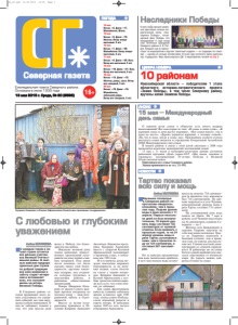 ПОГОДА Северная газета 14 мая Ночью: +6. Днем: +17. Малооблачно. Штиль. 15 мая Ночью: +8. Днем: +19. Облачно. Ветер северовосточный, 2 м/с 16 мая Ночью: +7. Днем: +20. Малооблачно. Ветер северовосточный, 3 м/с 17 мая Ночью: +8. Днем: +20. Ясно. Ветер юго-восточный, 4 м/с 18 мая Ночью: +10. Днем: +21. Ясно. Ветер юго-восточный, 4 м/с 19 мая Ночью: +13. Днем: +15. Облачно, дождь, гроза. Ветер юго-западный, 5 м/с 20 мая Ночью: +10. Днем: +16. Малооблачно, небольшой дождь. Ветер юго-западный, 5 м/с Наследники Победы Åæåíåäåëüíàÿ ãàçåòà Ñåâåðíîãî ðàéîíà. Îñíîâàíà â èþíå 1935 ãîäà 6 мая в КДЦ прошел район ный фестиваль военно пат риотической песни «Нас ледники Победы», посвя щенный Дню Победы. Его инициатором 4 года назад стал Почетный гражданин Северного района А. В. Пет ров. Каждый год он присут ствует на мероприятии и вручает памятный подарок — по традиции это само вар — одному из лучших коллективов. В этом году почетного приза удостоен хор «Сударушка» Верх Красноярского ДК. О мероприятии читайте на стр. 5. 16+ 13 мая 2015 г. Среда, № 20 (8595) ЦИФРА НОМЕРА 10 районам Новосибирской области — победителям 1 этапа областного историко патриотического проекта «Знамя Победы», в том числе Северному району, вручены копии Знамени Победы. АНОНС Алёна МАТВЕЕВА С каждым годом в на шей стране остается все меньше участни ков Великой Отечест венной войны. В свет лые майские предпра здничные дни страна по доброй традиции все свое внимание и заботу отдает ветера нам и вспоминает всех, кто положил жизнь на алтарь Великой Победы. В Северном районе се годня проживают всего де вять участников тех страш ных событий, все они окру жены особым вниманием. О них не забывают, помнят о том, что они внесли свой вклад в Победу, что благо даря им мы живем. Накануне великой даты члены районных общест венных организаций позд равили на дому наших слав ных ветеранов. Под звуки песен военных лет было сказано много слов благо дарности, вручены памят ные подарки, над создани ем которых трудились и школьники района, и районные общественные организации. Тамара Ивановна Наза рова от имени Совета жен щин вручила ветеранам по теплому пледу — знак безг раничной заботы и благо дарности. Вместе со всеми позд равления принимал и 88 летний Куприян Акимович Аксентьев. Накануне празд ника Куприян Акимович вместе с супругой Ксенией Афанасьевной вспоминают о прожитых годах, о побед ном мае 1945 года. И в те минуты, когда мо лодое поколение выражает благодарность за их вели кий подвиг, слезы блестят на глазах у наших ветера нов. Куприян Акимович и Ксения Афанасьевна с осо бым трепетом поблагодари ли всех за то, что о них пом нят, не забывают. Для самих фронтовиков навсегда главным событием жизни останется май 1945 года, залпы салюта Победы, слезы огромной радости и горечь потерь. В победных залпах 1945 го есть заслуга и Куприяна Акимовича. С любовью и глубоким уважением Куприян Акимович и Ксения Афанасьевна Аксентьевы принимают поздравления О важной роли семьи в обществе есть много мудрых высказываний! Вот некоторые из них: «В семье и каша гуще», «В хорошей семье и дети растут хорошие», «Вся семья вместе, так и душа на месте»; «Дерево держится корнями, а человек семьей», «На что и клад, когда в семье лад». Признанием особого статуса института семьи является и учреждение Генеральной Ассамблеей ООН Международного дня семьи. В нашем районе в связи с этой датой ежегодно 