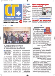ПОГОДА Северная газета 10 декабря Ночью: -3. Днем: -6. Пасмурно, небольшой снег. Ветер западный, 6 м/с 11 декабря Ночью: -9. Днем: -8. Пасмурно, небольшой снег. Ветер южный, 7 м/с 12 декабря Ночью: -7. Днем: -3. Пасмурно, небольшой снег. Ветер юго-западный, 5 м/с 13 декабря Ночью: -5. Днем: -6. Облачно. Ветер юго-западный, 5 м/с 14 декабря Ночью: -8. Днем: -5. Пасмурно, небольшой снег. Ветер юго-западный, 4 м/с 15 декабря Ночью: -6. Днем: -7. Пасмурно, снег. Ветер северо-западный, 3 м/с 16 декабря Ночью: -11. День: -14. Пасмурно, снег. Ветер северо-западный, 4 м/с Пусть впереди будет много побед! Åæåíåäåëüíàÿ ãàçåòà Ñåâåðíîãî ðàéîíà. Îñíîâàíà â èþíå 1935 ãîäà 16+ 9 декабря 2015 г. Среда, № 50 (8625) ЦИФРА НОМЕРА Более 60 тыс. волонтёров Новосибирской области участвовали в акциях «Георгиевская ленточка», «Бессмертный полк», «Сирень Победы», «День Неизвестного солдата» и др., посвященных 70#летию Великой Победы. ГОД ЛИТЕРАТУРЫ Участники встречи ПОЗДРАВЛЕНИЯ В конце ноября в правительстве Новосиби рской области состоялась торжественная церемония награждения самых одаренных детей нашей области. Среди них — участ ница образцовой студии изобразительного искусства «Радуга» КДЦ Северного района Мария Паршуткина. Мария не случайно стала обладателем стипендии губернато ра. Она с 2009 года занимается в студии «Радуга» (руководитель студии К.А. По чёпкина). Ее акварели отмечены празднич ной яркостью цвета, всегда выразительны и насыщены динамикой. Мария — посто янный участник районных, областных, всероссийских и международных выставок и конкурсов. Подробнее о талантливой девушке читайте на стр. 4 Литературно художе ственный журнал «Си бирские огни» хорошо известен читателю старшего поколения: он был очень популя рен в 70 80 е годы прошлого века. В нем публиковались произведения широко изве стных не только в Сибири, но и во всей стране писате лей и поэтов, таких, как В. Шишков, В. Шукшин, В. Астафьев, В. Распутин, П. Васильев, Л. Мартынов, Н. Грехова. У сегодняшней молодежи это издание, к со жалению, не пользуется спросом. А журнал не менее интересен, в нем печатаются начинающие, но незауряд ные и талантливые авторы во всем спектре литературных жанров. В конце ноября в цент ральной библиотеке в рам ках областного культурно образовательного проекта «Открытый университет Си бири» состоялась встреча с редакторами журнала «Си бирские огни»: поэтом и дра матургом Дмитрием Рябо вым и литературным крити ком Михаилом Косыревым. Общаясь с северянами, гости затронули ряд интересных вопросов, касающихся проб лем писательского мастер ства, творческих планов ли тературного издания, разви тия сибирской литературы. Рассказали, как и кем отби раются литературные произ ведения для публикации (оказывается, абсолютно любой пишущий человек может направить свои мате риалы, и если они окажутся достойными, их обязательно опубликуют). Сегодня руководство журнала планирует издание спецвыпусков, посвящен ных районам области. Поэ тому Дмитрий Геннадьевич обратился к северянам с просьбой присылать свои стихи, прозу, публицистику. Вместе с редакторами «Сибирских огней» у нас в гостях побывала молодая по этесса Кристина Кармалита. Рассказав немного о себе, она познакомила присут ствующих со своим творче ством. Ее проникновенные, немного грустные стихи зас тавляют задуматься о вечных ценностях: о смысле жизни, любви, добре и зле. Кр