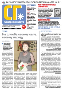 ПОГОДА Северная газета Åæåíåäåëüíàÿ ãàçåòà Ñåâåðíîãî ðàéîíà. Îñíîâàíà â èþíå 1935 ãîäà 26 апреля 2017 г. Среда, № 17 (8697) 16+ ЦИФРА НОМЕРА 6000 РУБЛЕЙ в одну сторону составит стоимость билета на рейс Новосибирск — Симферополь с 15 мая по 30 ноября 2017 г. Воспользоваться им смогут граждане России в возрасте до 23 лет, пенсионеры, инвалиды 1 группы, инвалиды детства и сопровождающие их лица. ВСЕ НОВОСТИ НОВОСИБИРСКОЙ ОБЛАСТИ НА САЙТЕ VN.RU ГАЗЕТА ПРОДАЁТСЯ ВО ВСЕХ ПОЧТОВЫХ ОТДЕЛЕНИЯХ РАЙОНА! ПОЗДРАВЛЕНИЯ Алёна МАТВЕЕВА Органы местного самоуправления — самая близкая для граждан власть, именно сюда люди обращаются со своими проблемами и бедами, стремясь найти понимание и помощь. Именно 21 апреля 1785 года императрица Екатерина II утвердила «Грамоту на пра ва и выгоды городам Рос сийской империи». Доку мент фактически положил начало развитию российско го законодательства о мест ном самоуправлении. 21 апреля состоялось праздничное мероприятие, посвященное Дню местного самоуправления, на который собрались специалисты районной и сельских адми нистраций. Со словами приветствия и добрыми пожеланиями к ви новникам торжества обрати лись глава Северного района Сергей Владимирович Ко ростелев и председатель Со вета депутатов Северного района Игорь Викторович Звыков. В этом году Новоси бирской области исполняет ся 80 лет. И в целях поощре ния граждан за заслуги перед регионом учреждена юби лейная медаль «80 лет Ново сибирской области». В тор жественной обстановке 13 граждан Северного района были награждены этой ме далью. Лучшие муниципаль ные служащие были отмече ны Почетной грамотой и Благодарностью главы Се верного района и Благодар ностью Совета депутатов Се верного района. Одна из награжденных Почетной грамотой главы Северного района — Ольга Адамовна Савченко, специа лист администрации Север ного сельсовета. На службе народу и родному селу Ольга Адамовна уже 28 лет. За это время сменились четверо глав Северного сельсовета. В основные обязанности специалиста входит ежеднев ная работа с обращениями граждан, похозяйственный учет, демографическая отчет ность. Коллектив админист рации небольшой и очень дружный, каждый день в ра бочей атмосфере царят добро желательность и взаимовы ручка. Это, как считает Ольга Адамовна, очень помогает в работе и положительно ска зывается на результатах. У каждого, кто приходит на прием в сельский совет, есть какие то проблемы, вопро сы, которые глава админист рации вместе со специалис тами стараются решить. За многолетнюю работу Ольга Адамовна неоднок ратно отмечалась почетны ми грамотами и благодар ностями разного уровня. Коллеги отзываются о ней как о добром, отзывчивом человеке, который всегда готов прийти на помощь. Новая рубрика нашей газеты «О героях былых времен» пользуется популярностью. Редакция получила несколько материалов от читателей, в которых они рассказывают о своих родных, земляках — защитниках Родины. В преддверии Дня Победы предлагаем рассказ о семье Комковых, жителях села Верх-Красноярка, которые на протяжении 100 лет стоят на страже Родины. О трех поколениях Комковых читайте на стр. 5 27 апреля Ночью: +8. Днем: +16. Пасмурно, небольшой дождь. Ветер западный, 5 м/с 28 апреля Ночью: +6. Днем: +15. Ясно. Ветер восточный, 4 м/с 29 апреля Ночью: +8. Днем: +13. Малооблачно. Ветер северозападный, 6 м/с 30 апреля Ночью: +2. Днем: +5. 