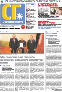 Коб-Кордоновская школа находится в числе лидеров регионального конкурса «Госуслуги – это просто». По его итогам определится лучшая школа Новосибирской области по организации работы с электронными сервисами на Едином портале госуслуг. Подробнее о конкурсе и участии в нем школ Северного района на стр. 4 ПОГОДА Северная газета Åæåíåäåëüíàÿ ãàçåòà Ñåâåðíîãî ðàéîíà. Îñíîâàíà â èþíå 1935 ãîäà 29 ноября 2017 г. Среда, № 48 (8728) 16+ ЦИФРА НОМЕРА 4 МИЛЛИОНА 631 ТЫСЯЧА РУБЛЕЙ получено из бюджетов всех уровней cельскохозяйственными предприятиями Северного района в 2017 году. ВСЕ НОВОСТИ НОВОСИБИРСКОЙ ОБЛАСТИ НА САЙТЕ VN.RU ГАЗЕТА ПРОДАЁТСЯ ВО ВСЕХ ПОЧТОВЫХ ОТДЕЛЕНИЯХ РАЙОНА! 30 ноября Ночью: -19. Днем: -13. Ясно. Штиль 1 декабря Ночью: -19. Днем: -15. Пасмурно. Ветер северный, 2 м/с 2 декабря Ночью: -16. Днем: -15. Пасмурно, небольшой снег. Ветер северный, 1 м/с 3 декабря Ночью: -12. Днем: -10. Пасмурно. Ветер северный, 5 м/с 4 декабря Ночью: -8. Днем: -4. Пасмурно, небольшой снег. Ветер юго-западный, 4 м/с 5 декабря Ночью: -3. Днем: -4. Пасмурно, снег. Ветер югозападный, 3 м/с 6 декабря Ночью: -11. Днем: -11. Пасмурно. Ветер юговосточный, 2 м/с ПРАЗДНИК НОВОСТИ РЕГИОНА О ГОСУСЛУГАХ ДЛЯ ДЕТЕЙ И РОДИТЕЛЕЙ Алёна МАТВЕЕВА В конце года, когда уже убран хлеб с полей и поголовье скота переведено на зимне стойловое содержание, отмечается День работника сельского хозяйства. В этот день чествуют предста вителей разных профессий — аг рономов, животноводов, механи заторов, работников сельхозпре дприятий и фермерских хозяйств. Перед каждым из них стоит своя задача, но их всех объединяет од но: они трудятся от зари до позд ней ночи, без выходных и празд ничных дней, своим трудом пос тавляя на наши столы мясо и мо локо, в неблагоприятных для рас тениеводства погодных условиях выращивают для нас хлеб. И в этот праздничный день мы низко кла няемся работникам сельского хо зяйства, говорим слова благодар ности и признательности за их не легкий труд. День работника сельского хо зяйства — это время подвести ито ги уходящего года, наметить пла ны на следующий, назвать имена лучших тружеников. В зрительном зале культурно досугового центра на праздничную программу собра лись представители практически всех сельхозпредприятий и фер мерских хозяйств района. Со сло вами благодарности и теплыми пожеланиями к землякам обрати лись глава Северного района Сер гей Владимирович Коростелев и председатель Совета депутатов Северного района Игорь Викторо вич Звыков. В торжественной обстановке за многолетний труд, профессио нальные достижения были отме чены лучшие труженики сельско го хозяйства. Почетной грамотой губернатора Новосибирской об ласти и Почетной грамотой главы Северного района награжден Вла димир Константинович Сандзюк, индивидуальный предпринима тель; Благодарностью губернатора Новосибирской области отмечены Владимир Петрович Ничков, ком байнер ООО «Колхоз Наша Роди на», Николай Яковлевич Дьячук, тракторист ООО «Колхоз Наша Родина», Валерий Дмитриевич Лебедев, директор ООО «Борьба за мир». За личный вклад и высокие профессиональные достижения Благодарностью министерства сельского хозяйства Новосибирс кой области отмечен Вячеслав Павлович Мосиявич, тракторист СПК «Останинской», Почетной грамотой Законодательного соб рания Новосибирской области награжден Павел Владимирович Коржов, председатель СПК «О