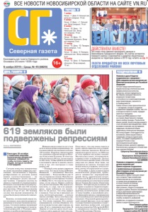 ВСЕ НОВОСТИ НОВОСИБИРСКОЙ ОБЛАСТИ НА САЙТЕ VN.RU 6 ноября 2019 г. Среда, № 45 (8829) 16+ Еженедельная газета Северного района. Основана 20 июля 1935 года ГАЗЕТА ПРОДАЁТСЯ ВО ВСЕХ ПОЧТОВЫХ ОТДЕЛЕНИЯХ РАЙОНА! ПОГОДА Северная газета 7 ноября Ночью: -1. Днем: 0. Сильный снег, ветер юго-западный, 13 м/с 8 ноября Ночью: -9. Днем: +1. Сильный снег. Ветер западный, 14 м/с 9 ноября Ночью: -19. Днем: - 14. Небольшой снег. Ветер юго-западный, 14 м/с 10 ноября Ночью: -19. Днем: -13. Переменная облачность. Ветер юго-западный, 8 м/с 11 ноября Ночью: -15. Днем: -10. Пасмурно. Ветер западный, 7 м/с 12 ноября Ночью: -12. Днем: -9. Пасмурно, небольшой снег. Ветер северный, 9 м/с 13 ноября Ночью: -12. Днем: -9. Переменная облачность. Ветер северный, 12 м/с ДЕНЬ ПАМЯТИ ДЕЙСТВУЕМ ВМЕСТЕ! Эти слова стали девизом прошедшего накануне в Новосибирске Гражданского форума. Об участии активистов Северного района в мероприятии и развитии общественных инициатив на территории района в 2019 году читайте на стр. 4 619 земляков были подвержены репрессиям Алёна МАТВЕЕВА JJЕжегодно 30 октября у памятника жертвам политических репрессий северяне собираются, чтобы почтить память тех людей, которые погибли и пострадали. Сегодня известны невероятные по своим масштабам цифры расстрелянных, заключенных в тюрьмы, разбросанных по детским домам наших соотечественников — их число превышает десять миллионов человек. Страшная система не обошла стороной и Северный район. 619 наших земляков были подвергнуты репрессиям. Из них 336 человек расстреляны, 120 человек осуждены на срок от 4 до 25 лет, 101 человек сослан под надзор комендатур, 62 семьи были раскулачены без высылки. Конечно, это неполный список тех, кто пострадал, ведь многие репрессированные и их родственники разъехались. Сегодня в районе проживают 7 граждан, пострадавших от политических репрессий, и 48 репрессированных и реабилитированных. Живыми свидетелями тех лет стали дети и внуки репрессированных, их в нашем районе насчитывается более 120 человек. Одной из свидетельниц тех страшных событий является Наталья Алексеевна Разумова. В этом году ей исполнилось 94 года, но она нашла в себе силы, чтобы прийти на митинг и возложить цветы в память своего отца и тех, кто пострадал в годы репрессий. —В нашей семье репрессировали моего отца. Его звали Алексей Фомич Ямщиков, — вспоминает Наталья Алексеевна. —Тогда мне было уже 12 лет, и я хорошо все помню. Папа был на работе, когда за ним пришел человек из НКВД. Но то, что отца не оказалось дома, его не спасло. Прямо с работы его увели в милицию. Мы ждали его всю ночь, а с утра, так и не дождавшись, мама побежала его искать. Кто-то ей сказал, что отца держат в подвале. Там он так и просидел до суда, почти пять месяцев — с начала мая по сентябрь. Хоть я и не была еще взрослой, но на суде присутствовала. Это очень страшно. Его сильно допрашивали, а потом объявили, что отец осуждается как «враг народа» на срок 10 лет с лишением всех прав. В тюрьму его увезли сразу после суда. Сначала связь держали через письма. Отец писал, что ему очень тяжело и плохо, просил прислать хоть сухарей. Мама, конечно, высылала. Потом его перевели в другое место, а в 1940 году от отца пришло последнее письмо. Мы пытались узнать, что произошло, и пришел ответ «о выбытии». Для нас так и осталось неизвестным, сам отец умер или его убили. Я не знаю, где находится его могила. Сегодня мне нужно попасть в церковь, хо
