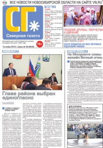 ВСЕ НОВОСТИ НОВОСИБИРСКОЙ ОБЛАСТИ НА САЙТЕ VN.RU 13 ноября 2019 г. Среда, № 46 (8830) 16+ Еженедельная газета Северного района. Основана 20 июля 1935 года ГАЗЕТА ПРОДАЁТСЯ ВО ВСЕХ ПОЧТОВЫХ ОТДЕЛЕНИЯХ РАЙОНА! Глава района выбран единогласно Раиса АКИЛИНА JJ7 ноября в Северном районе состоялись выборы главы. Мы уже сообщали, что решение о проведении конкурса по отбору кандидатур на должность главы Северного района было принято 19 сентября на сессии районного Совета депутатов. Решением сессии также были утверждены члены комиссии от Совета депутатов Северного района и дата проведения конкурса — 7 ноября 2019 года. В состав комиссии со стороны районного Совета депутатов вошли И.В. Звыков (секретарь комиссии), председатель Совета депутатов, депутаты от политических партий Н.Ф. Яровая (КПРФ), А.М. Исмайлов (ЛДПР), Р.В. Акилина (ЕР). Со стороны губернатора Новосибирской области в комиссию были включены: Е.Л. Бузмаков, заместитель министра региональной политики НСО, председатель комиссии, А.С. Авсейков, заместитель министра, главный архитектор министерства строительства НСО, А.В. Рафаелян, депутат Заксобрания НСО, и Е.С. Рахимов, консультант управления по работе с территориями минрегионполитики НСО. 18 октября завершился прием документов кандидатов на должность главы Северного района. На конкурс поступило 2 заявления: от Сергея Владимировича Коростелева, действующего главы Северного района, и Евгения Владимировича Довганя, главы рабочего поселка Чаны. 7 ноября состоялось заседание комиссии по отбору кандидатур на должность главы Северного района. Кандидаты прошли тестирование на знание нормативно-правовой базы и представили свои программы развития района на период до 2030 года. Также члены комиссии задавали кандидатам вопросы, касающиеся социального и экономического развития района. Большее количество вопросов, которые касались демографической ситуации в районе, качества жизни жителей, трудоустройства, социальной сферы и др. было задано С.В. Коростелеву. Сергей Владимирович дал развернутые и обоснованные ответы на все вопросы. По итогам тестирования С.В. Коростелев набрал 29 баллов из 30, Е.В. Довгань — 28 баллов. За презентацию программы развития территории средний балл С.В. Коростелева составил 4,4, а Е.В. Довганя — 3,5 из 5 возможных. Решением комиссии оба кандидата были рекомендованы для утверждения сессией Совета депутатов. На сессии, которая состоялась в этот же день, депутаты Совета депутатов единогласно утвердили на должность главы Северного района Сергея Владимировича Коростелева. ПОГОДА Северная газета 14 ноября Ночью: -17. Днем: -9. Переменная облачность, небольшой снег. Ветер северо-восточный, 5 м/с 15 ноября Ночью: -23. Днем: -19. Переменная облачность, небольшой снег. Ветер северный, 5 м/с 16 ноября Ночью: -27. Днем: -23. Ясно. Ветер северный, 2 м/с 17 ноября Ночью: -24. Днем: -12. Переменная облачность, небольшой снег. Ветер южный, 7 м/с 18 ноября Ночью: -11. Днем: -6. Пасмурно, небольшой снег. Ветер южный, 7 м/с 19 ноября Ночью: -5. Днем: -2. Пасмурно, снег. Ветер южный, 6 м/с 20 ноября Ночью: -11. Днем: -5. Пасмурно, небольшой снег. Ветер юго-восточный, 6 м/с ПРАЗДНИК ДРУЖБЫ, ТВОРЧЕСТВА И ЕДИНЕНИЯ В Северном районе в День народного единства прошло множество интересных мероприятий: конкурс молодых исполнителей «Шанс», фестиваль национальной кухни, праздничный концерт «Великая Россия, в един