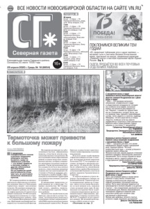 ВСЕ НОВОСТИ НОВОСИБИРСКОЙ ОБЛАСТИ НА САЙТЕ VN.RU 29 апреля 2020 г. Среда, № 18 (8854) 16+ еæåíåäåëüíàÿ ãàçåòà сåâåðíîãî ðàéîíà. оñíîâàíà 20 èþëÿ 1935 ãîäà ГАЗЕТА ПРОДАЁТСЯ ВО ВСЕХ ПОЧТОВЫХ ОТДЕЛЕНИЯХ РАЙОНА! ПОГОДА Северная газета 30 апреля Ночью: +8. Днем: +16. Переменная облачность, дождь, гроза. Ветер западный, 5 м/с 1 мая Ночью: +5. Днем: +10. Переменная облачность, дождь. Ветер юго-западный, 4 м/с 2 мая Ночью: +4. Днем: +11. Переменная облачность, небольшой дождь. Ветер северо-западный, 6 м/с 3 мая Ночью: +2. Днем: +12. Переменная облачность. Ветер западный, 3 м/с 4 мая Ночью: +6. Днем: +18. Переменная облачность, небольшой дождь. Ветер южный, 6 м/с 5 мая Ночью: +5. Днем: +11. Пасмурно, дождь. Ветер северо-западный, 6 м/с 6 мая Ночью: +2. Днем: +10. Переменная облачность. Ветер юго-западный, 4 м/с ПОКЛОНИМСЯ ВЕЛИКИМ ТЕМ ГОДАМ «СГ» продолжает публикацию эссе о наших земляках — ветеранах тыла и участниках Великой Отечественной войны, присланных на конкурс, объявленный редакцией «Северной газеты» и местным отделением партии «Единая Россия». Стр. 5. АКТУАЛЬНО С праздником весны и труда! Уважаемые жители Новосибирской области! Дорогие земляки! Поздравляем вас с Днем весны и труда! 1 Мая — это праздник весеннего обновления, созидательного труда и общественной солидарности. Сегодня мы особенно ясно видим, насколько важны эти ценности для каждого из нас. Уверены, с какими бы трудностями мы ни сталкивались сегодня, весна, как и в прежние годы, принесет новосибирцам солнце, тепло, радость и, конечно, надежду. Убеждены, что все наши мечты и планы сбудутся, особенно если мы вместе подкрепим их талантом и ответственностью. Берегите себя и своих близких, будьте здоровы и счастливы! С праздником! Губернатор Новосибирской области А.А. ТРАВНИКОВ Председатель Законодательного Собрания Новосибирской области А.И. ШИМКИВ *** Уважаемые жители Северного района! Примите самые искренние поздравления с праздником Весны и Труда! 1 Мая — праздник для всех, кто своим ежедневным трудом создает завтрашний день, будущее района. Честный, добросовестный труд — основа успешного развития любого общества. Желаем всем вам, вашим родным и близким крепкого здоровья, благополучия, весеннего процветания. Пусть всегда сбываются ваши желания и мечты, ладится доброе дело, а труд приносит удовлетворение и достаток! Глава Северного района С.В. КОРОСТЕЛЕВ Председатель Совета депутатов Северного района И.В. ЗВЫКОВ *** Уважаемые жители Северного района! Поздравляю вас с праздником 1 Мая — Днём весны и труда! Пусть наступившая яркая и теплая весна принесет в вашу жизнь спокойствие, надежду на благополучие общества, подъем экономики, улучшение качества жизни. Пусть ваше желание трудиться на производстве в полном объеме, а на дачном участке — без ограничений, реализуется уже в ближайшие дни. Именно невозможность полноценно трудиться показала нам, насколько важен для человека труд умственный и физический. Желаю вам здоровья, личного счастья, успехов в труде, весеннего настроения! Депутат Заксобрания НСО А.В. РАФАЕЛЯН Термоточка может привести к большому пожару Алёна МАТВЕЕВА JС введением пожароопасного сезона в регионе запрещено разводить костры, выжигать траву на земельных участках — это может привести к лесному пожару и другим губительным последствиям. Из-за поджогов сухой растительности огонь уже чуть не уничтожил несколько насе