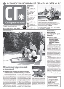ВСЕ НОВОСТИ НОВОСИБИРСКОЙ ОБЛАСТИ НА САЙТЕ VN.RU 20 мая 2020 г. Среда, № 21 (8857) 16+ Еæåíåäåëüíàÿ ãàçåòà Сåâåðíîãî ðàéîíà. Оñíîâàíà 20 èþëÿ 1935 ãîäà ГАЗЕТА ПРОДАЁТСЯ ВО ВСЕХ ПОЧТОВЫХ ОТДЕЛЕНИЯХ РАЙОНА! ПОГОДА Северная газета 21 мая Ночью: +13. Днем: +23. Переменная облачность. Ветер юго-восточный, 3 м/с 22 мая Ночью: +13. Днем: +20. Облачно, дождь. Ветер юго-западный, 5 м/с 23 мая Ночью: +10. Днем: +23. Ясно. Ветер южный, 3 м/с 24 мая Ночью: +15. Днем: +26. Пасмурно, дождь. Ветер юго-восточный, 6 м/с 25 мая Ночью: +13. Днем: +20. Облачно, дождь. Ветер северо-западный, 5 м/с 26 мая Ночью: +12. Днем: +21. Облачно. Ветер западный, 5 м/с 27 мая Ночью: +11. Днем: +14. Облачно, дождь. Ветер северо-западный, 8 м/с ПОЗДРАВИЛИ ПЕСНЕЙ В День Победы по всем улицам райцентра проехал украшенный автомобиль с агитбригадой КДЦ. Работники культурно-досугового центра Сергей Осипов, Елена Кривенко, Алексей Закамский и Сергей Иванов в военной форме исполняли песни военных лет. Стр. 4. ДЕНЬ ПОБЕДЫ ЗНАТЬ И ПОМНИТЬ 6 тысяч жителей Северного района воевали на фронтах Великой Отечественной войны. Около 2 тысяч погибли, защищая свободу и независимость Родины. Более 1500 наших земляков, рядовых и офицеров, награждены правительственными наградами. АКТУАЛЬНО Волонтёры на переднем крае борьбы JГубернатор Андрей Травников обсудил с сотрудниками волонтерского центра партии «Единая Россия» новые форматы помощи жителям региона и поблагодарил их за эффективную, слаженную работу. «Вы приносите людям не только продукты или лекарства, но и заряд оптимизма, радость, доброту, улыбки. Пусть эти улыбки сегодня скрыты под масками, но глаза все равно улыбаются. Это очень важно», — поблагодарил волонтеров глава региона. Он напомнил, что Новосибирская область — один из регионов-лидеров по развитию добровольческого движения. Особенно ярко это проявилось в непростой период борьбы с коронавирусной инфекцией. Всё большее количество людей стремится бескорыстно помогать тем, кто в этом нуждается. Волонтерский центр партии по противодействию распространению коронавирусу работает уже почти два месяца. За это время волонтеры предложили помощь более 1600 новосибирцам из групп риска: ветеранам Великой Отечественной войны, одиноким и маломобильным гражданам. С их помощью организована доставка ежедневных горячих обедов и «чайных» продуктовых наборов врачам. Среди новых форматов работы волонтеров — проведение консультаций о новых мерах социальной поддержки, инициированных президентом ВладимиромПутиным. Не менее важна для волонтерского центра и другая задача — получить обратную связь от жителей. Пресс-служба губернатора и правительства НСО Праздник душевный и личный JГубернатор Андрей Травников в День Победы почтил память сибиряков, павших на полях сражений Великой Отечественной войны, возложив цветы к Вечному огню на Монументе славы. Участниками церемонии возложения цветов и венков на Монументе славы стали полномочный представитель Президента РФ в Сибирском федеральном округе Сергей Меняйло, председатель Заксобрания Новосибирской области АндрейШимкив. До начала торжественной церемонии губернатор Андрей Травников проконтролировал завершение реконструкции территории Монумента славы, которая была проведена к празднованию 75-й годовщины Победы. В Северном районе в День Победы жители райцентра могли прийти в Сквер памяти, принести цве