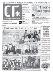 ВСЕ НОВОСТИ НОВОСИБИРСКОЙ ОБЛАСТИ НА САЙТЕ VN.RU 15 июля 2020 г. Среда, № 29 (8865) 16+ еæåíåäåëüíàÿ ãàçåòà сåâåðíîãî ðàéîíà. оñíîâàíà 20 èþëÿ 1935 ãîäà ГАЗЕТА ПРОДАЁТСЯ ВО ВСЕХ ПОЧТОВЫХ ОТДЕЛЕНИЯХ РАЙОНА! ПОГОДА Северная газета С КЕМ РАЙОН УСПЕШНЕЕ? Подведены итоги конкурса общественных стартапов «Со мной регион успешнее». Большинство проектов направлено на благоустройство территорий, решение социальных задач. Подробнее о каждом проекте мы расскажем в следующем номере «СГ». 16 июля Ночью: +16. Днем: +30. Ясно. Ветер юго-западный, 3 м/с 17 июля Ночью: +21. Днем: +32. Переменная облачность, дождь, гроза. Ветер северный, 3 м/с 18 июля Ночью: +21. Днем: +30. Переменная облачность, дождь, гроза. Ветер северо-восточный, 2 м/с 19 июля Ночью: +21. Днем: +31. Ясно. Ветер юго-восточный, 2 м/с 20 июля Ночью: +21. Днем: +31. Ясно. Ветер южный, 2 м/с 21 июля Ночью: +21. Днем: +29. Облачно, дождь, гроза. Ветер северо-восточный, 4 м/с 22 июля Ночью: +19. Днем: +29. Облачно, небольшой дождь. Ветер северо-восточный, 4 м/с ДАТА JУважаемые читатели! Вы держите в руках необычный номер районной газеты. Да, на нем, как всегда, стоит дата выпуска — 15 июля, номер за 2020 год — 29, и номер 8865. Именно столько газет вышло со дня рождения районки. Первый номер газеты «За большевистские колхозы» вышел в свет 85 лет назад — 20 июля 1935 года. За это время районка сменила несколько названий: «За большевистские колхозы», «По сталинскому пути», «За дело ленинизма», «За дело Ленина». Свое нынешнее название «Северная газета» получила в 1994 году в результате открытого голосования читателей. «Северная газета» занимает достойное место в истории района. На протяжении многих десятилетий она рассказывала обо всех значимых и рядовых событиях, о достойных людях, тружениках, их делах и успехах. Районка была летописцем истории нашей малой родины, всегда «шагала в ногу со временем», откликалась на события в мире и стране, в области и районе. Сегодня мы поздравляем со славным юбилеем всех, кто в разные годы был причастен к созданию газеты, кто работал в редакции и типографии, кто сотрудничал, писал заметки и корреспонденции, кто предоставлял информацию. Кто просто на протяжении многих лет с нетерпением ожидал каждый новый номер. Сюбилеем, родная газета! Номер районной газеты «За большевистские колхозы» от 6 ноября 1936 года Коллектив редакции и типографии. Вторая половина 1950-х годов Женская половина редакции и типографии. 1966 год Редакция газеты «За дело Ленина». 1980 год Журналист Аркадий Шарапинский. Это имя было известно каждому жителю района. Он писал много, на разные темы, но всегда — компетентно, ответственно и талантливо «Книга почета» хранится в редакции с 1974 года. В нее «…за многолетний и плодотворный труд в советской печати» занесены редактор Александр Иванович Шушаков и ответственный секретарь Евдокия Матвеевна Толстикова