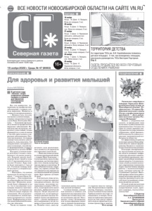 ВСЕ НОВОСТИ НОВОСИБИРСКОЙ ОБЛАСТИ НА САЙТЕ VN.RU 16+ Åæåíåäåëüíàÿ ãàçåòà Ñåâåðíîãî ðàéîíà. Îñíîâàíà 20 èþëÿ 1935 ãîäà ГАЗЕТА ПРОДАЁТСЯ ВО ВСЕХ ПОЧТОВЫХ ОТДЕЛЕНИЯХ РАЙОНА! 18 ноября 2020 г. Среда, № 47 (8883) Северная газета 19 ноября Ночью: -10. Днем: -6. Пасмурно. Ветер юго-западный, 5 м/с 20 ноября Ночью: -6. Днем: -5. Пасмурно, снег. Ветер юго-западный, 6 м/с 21 ноября Ночью: -4. Днем: -2. Переменная облачность, небольшой снег. Ветер юго-западный, 6 м/с 22 ноября Ночью: -8. Днем: -4. Переменная облачность. Ветер западный, 3 м/с 23 ноября Ночью: -8. Днем: -4. Пасмурно, снег. Ветер северо-западный, 2 м/с 24 ноября Ночью: -7. Днем: -5. Пасмурно, снег. Ветер южный, 2 м/с 25 ноября Ночью: -12. Днем: -8. Переменная облачность. Ветер западный, 3 м/с ТЕРРИТОРИЯ ДЕТСТВА На территории ТОСа им. В.И. Коробейникова появилась детская площадка. О том, как возводилась площадка, рассказала руководитель ТОСа Виктория Подгорная. Стр. 2. ПОГОДА Уважаемые сотрудники и ветераны Управления Федеральной налоговой службы по Новосибирской области! Поздравляем вас с 30-летиемФедеральной налоговой службы России и профессиональным праздником — Днем работника налоговых органов Российской Федерации! Можно с уверенностью сказать: за прошедшие годы налоговая служба изменилась принципиально. Сегодня это один из самых прочных инструментов государственного управления, гарант финансовой безопасности страны и социально-экономической стабильности общества. От эффективности работы налоговых органовНовосибирской области зависит формирование бюджета и экономическое благополучие региона. Благодаря своевременному поступлению налогов наша область развивает инфраструктуру, реализует социально значимые программы, внедряет масштабные инновационные проекты. Сегодня налоговая служба успешно использует современные технологии, новые перспективные формы работы с налогоплательщиками, улучшает качество обслуживания граждан. Высокий профессионализм работников налоговых органов, мастерство, преданность делу способствуют дальнейшему успешному развитию региона. От всей души желаем вам успехов в решении важных государственных задач, крепкого здоровья, счастья и благополучия! Губернатор Новосибирской области А.А. ТРАВНИКОВ Председатель Законодательного собрания Новосибирской области А.И. ШИМКИВ ПОЗДРАВЛЕНИЕ ОБРАЗОВАНИЕ Алёна МАТВЕЕВА В детском саду «Сказка» скоро откроются соляная пещера и комната для принятия кислородных коктейлей. Все эти новшества направлены на профилактику заболеваний, в первую очередь вирусных. Появится в садике и сенсорная комната. —Начнем с того, что у нас построена соляная пещера, — говорит заведующая детским садомНина Леонтьевна Иванова. — Основной функцией ее является профилактика вирусных заболеваний. Наши дети еще маленькие, иммунитет у них слабый, только формируется, и они склонны к частым простудным и вирусным заболеваниям. Поэтому мы надеемся, что пещера поможет нам снизить заболеваемость, ведь доказано, что микроклимат, который создан в галокамере, способствует формированию стойкого иммунитета у детей к ОРВИ. Посещать соляную пещеру дети будут только с письменного согласия родителей. Каждой группе необходимо будет пройти курс в 10-15 посещений длительностью 30 минут. Курс можно будет повторять 2-3 раза в год. Соляную пещеру можно посещать со второй младшей группы. — Повторюсь, что д