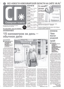 ВСЕ НОВОСТИ НОВОСИБИРСКОЙ ОБЛАСТИ НА САЙТЕ VN.RU 16+ Åæåíåäåëüíàÿ ãàçåòà Ñåâåðíîãî ðàéîíà. Îñíîâàíà 20 èþëÿ 1935 ãîäà ГАЗЕТА ПРОДАЁТСЯ ВО ВСЕХ ПОЧТОВЫХ ОТДЕЛЕНИЯХ РАЙОНА! 25 ноября 2020 г. Среда, № 48 (8884) Северная газета 26 ноября Днем: -8. Ночью: -11. Пасмурно. Ветер юго-западный, 4 м/с 27 ноября Днем: -8. Ночью: -9. Пасмурно. Ветер юго-западный, 6 м/с 28 ноября Днем: -10. Ночью: -17. Переменная облачность. Ветер западный, 8 м/с 29 ноября Днем: -6. Ночью: -11. Переменная облачность, слабый снег. Ветер западный, 5 м/с 30 ноября Днем: -6. Ночью: -12. Пасмурно, снег. Ветер северо-западный, 8 м/с 1 декабря Днем: -6. Ночью: -13. Пасмурно, снег. Ветер северо-западный, 9 м/с 2 декабря Днем: -7. Ночью: -10. Пасмурно, снег. Ветер западный, 9 м/с Общественники района подводят итоги первого этапа конкурса общественных стартапов Новосибирской области «Со мной регион успешнее». Сегодня предлагаем читателям познакомиться еще с тремя проектами. Все подробности — на стр. 2. ПОГОДА Чем богат родной край Рассказать об объектах природы, выдающихся земляках, гастробрендах, традициях, промыслах приглашаются жители Новосибирской области в рамках конкурса «Топ-1000 культурных туристических брендов России». Общественный проект «Живое наследие», реализуемый при поддержке Фонда президентских грантов, собирает воедино информацию об объектах, образах, традициях, великих именах, памятных датах и событиях, локализованных на российских территориях. Первые топ-500 культурных брендов были отобраны членами экспертного жюри проекта и описаны на портале. В настоящее время проект «Живое наследие» выходит на новый этап— составление списка топ-1000 культурных и туристических брендов. Предполагается, что в список войдут известные преимущественно на локальном уровне бренды (культурные и символические природные объекты, образы, традиции и промыслы, события и даты, великие имена, гастробренды, креативные кластеры), обладающие потенциалом для того, чтобы стать точками притяжения туристов, добровольцев и инвесторов, что будет вести к их культурному возрождению и экономическому развитию территорий. Конкурс проводится на портале Живоенаследие.рф. Срок окончания приема заявок — 15 января 2021 года. Пресс-служба губернатора и правительства НСО КОНКУРС РАЙОН В ЛИЦАХ Алёна МАТВЕЕВА За один день обойти больше десятка улиц райцентра, на которых расположены почти 400 домов, — это обычная работа почтальона. Светлана Ахтамовна Зуева работает в «Почте России» три года. Она обслуживает 3-й участок. Улицы Гоголя, Мичурина, Луговая, Красная, Чапаева, Покрышкина, Комсомольская, Спортивная, Школьная, Мелиоративная, Пугачева, начало Советской — за один день, в любую погоду, почтальон преодолевает 10-15 километров. — Сначала было нелегко, — вспоминает Светлана Ахтамовна. — Постепенно привыкла, познакомилась с людьми, проживающими на моем участке. Среда — самый трудный день, так как именно по средам мы разносим нашу районную газету, тогда и сумка тяжелее, и маршрут длиннее. Но мы не унываем и всегда рады встрече с людьми. Помимо газет и журналов, Светлана Зуева разносит письма, пенсии, а еще различные товары и продукты. — Мы с коллегами уже знаем, кому что предложить, — отмечает Светлана Ахтамовна. — Также выполняем просьбы по доставке определенных продуктов и товаров. А еще в день получения пенсии мы можем предложить пожилым людям оплатить коммуна