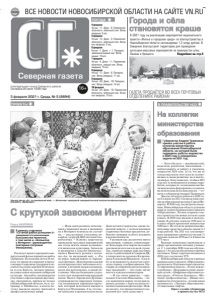ВСЕ НОВОСТИ НОВОСИБИРСКОЙ ОБЛАСТИ НА САЙТЕ VN.RU 16+ Åæåíåäåëüíàÿ ãàçåòà Ñåâåðíîãî ðàéîíà. Îñíîâàíà 20 èþëÿ 1935 ãîäà ГАЗЕТА ПРОДАЁТСЯ ВО ВСЕХ ПОЧТОВЫХ ОТДЕЛЕНИЯХ РАЙОНА! 3 февраля 2021 г. Среда, № 5 (8894) Северная газета 4 февраля Ночью: -11. Днем: -8. Переменная облачность, небольшой снег. Ветер западный, 8 м/с. 5 февраля Ночью: -13. Днем: -3. Переменная облачность, небольшой снег. Ветер юго-западный, 9 м/с. 6 февраля Ночью: -1. Днем: + 1. Пасмурно, небольшой мокрый снег. Ветер южный, 10 м/с. 7 февраля Ночью: -4. Днем: +1. Переменная облачность, мокрый снег. Ветер западный, 15 м/с. 8 февраля Ночью: -17. Днем: -8. Пасмурно, снег. Ветер западный, 17 м/с. 9 февраля Ночью: -20. Днем: -18. Пасмурно, снег. Ветер западный, 14 м/с. 10 февраля Ночью: -24. Днем: -18. Переменная облачность, небольшой снег. Ветер юго-западный, 10 м/с. ПОГОДА В ПРАВИТЕЛЬСТВЕ НСО ПРОЕКТЫ JJГубернатор Андрей Травников принял участие в работе коллегии министерства образования Новосибирской области, на которой были подведены работы ведомства в 2020 году и определены задачи на 2021 год. — Хотел бы всех — руководителей, педагогов, родителей, школьников — поблагодарить за работу в ушедшем, непростом 2020 году. За то, что вы не только выстояли этот год и не остановились в своем развитии, но и шагнули вперед. Хочу пожелать, чтобы в 2021 году все те возможности и новые наработки, которые из-за пандемии мы были вынуждены форсировано создавать, вы использовали по максимуму, — отметил губернатор Андрей Травников. Доклад об итогах работы в 2020 году и планах на 2021 год представил министр образования региона Сергей Федорчук. В 2020 году, несмотря на пандемию, Новосибирская область успешно решала задачи национального проекта «Образование». Регион сохранил темпы строительства новых детских садов и школ. В 2020 году введено в эксплуатацию 16 детских садов на 3190 мест и 6 школ общей проектной мощностью 5200 мест. На эти цели направлены финансовые средства в объеме свыше 4,3 млрд рублей. На 2021 год запланировано завершение строительства ещё 11 детских садов на 1870 мест и 4 школ на 3775 мест. Важные изменения произошли в сфере организации питания учащихся. С 1 сентября 2020 года все обучающиеся 1-4 классов обеспечены горячим питанием. Охват горячим питанием в 2020 году составляет 97%. ВНовосибирской области в рамках национального проекта «Образование» реализуются 10 региональных проектов: «Современная школа», «Успех каждого ребенка», «Поддержка семей, имеющих детей», «Цифровая образовательная среда», «Учитель будущего», «Молодые профессионалы», «Новые возможности для каждого», «Социальная активность», «Экспорт образования», «Социальные лифты». Пресс-служба губернатора и правительства НСО Раиса АКИЛИНА JJВ рамках стартапов «Со мной район успешнее-2» завершается реализация большинства проектов, в том числе и «Фольклор в Интернет» (руководитель Екатерина Петровна Финашкина). Реализует проект народный самодеятельный фольклорный ансамбль «Добродея». Коллективу почти 20 лет, и все это время он сохраняет и пропагандирует народные традиции и песенное наследие деревни Платоновка и села Бергуль, которое признано уникальным явлением сибирской культуры. Ансамбль неоднократно участвовал в фольклорных фестивалях, праздниках, причем не только в Новосибирской области, но и, например, в Забайкалье, и всегда получал высокую оценку зрителей и профессиональных жюри. —Идея снять роли