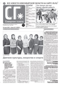 ВСЕ НОВОСТИ НОВОСИБИРСКОЙ ОБЛАСТИ НА САЙТЕ VN.RU 16+ Åæåíåäåëüíàÿ ãàçåòà Ñåâåðíîãî ðàéîíà. Îñíîâàíà 20 èþëÿ 1935 ãîäà ГАЗЕТА ПРОДАЁТСЯ ВО ВСЕХ ПОЧТОВЫХ ОТДЕЛЕНИЯХ РАЙОНА! 24 марта 2021 г. Среда, № 12 (8901) Северная газета 25 марта Ночью: -5. Днем: +1. Облачность, небольшой снег. Ветер юго-западный, 7 м/с. 26 марта Ночью: -4. Днем: +2. Ясно. Ветер юго-западный, 5 м/с. 27 марта Ночью: -3. Днем: +2. Переменная облачность, небольшой мокрый снег. Ветер юго-западный, 6 м/с. 28 марта Ночью: -2. Днем: +1. Пасмурно, снег с дождем. Ветер юго-западный, 5 м/с. 29 марта Ночью: -7. Днем: +4. Облачно, небольшой снег. Ветер северный, 8 м/с. 30 марта Ночью: -9. Днем: -4. Переменная облачность, небольшой снег. Ветер северный, 4 м/с. 31 марта Ночью: -12. Днем: -6. Малооблачно. Ветер северный 3 м/с. ПОГОДА ПОЗДРАВЛЕНИЯ ДЕНЬ РАБОТНИКА КУЛЬТУРЫ Уважаемые работники культуры, ветераны! Примите самые искренние поздравления с вашим профессиональным праздником — Днём работника культуры! Этот день стал общим профессиональным праздником для тех, кто отмечает День российской печати, Всемирный день поэзии, Международный день памятников и исторических мест, День музеев, День писателя, День театра, Всемирный день книг и авторского права и другие близкие праздники. У новосибирской культуры — давние традиции, богатая история, в которую внесли свой уникальный вклад многие талантливые люди творческих профессий, деятели искусства, а также хранители и популяризаторы культурного наследия. Новосибирская область славится своими культурными достижениями. Театры и библиотеки, консерватория и филармония, дома культуры и клубы — десятки учреждений, сотни мероприятий. И всё это делается вашими усилиями, усилиями людей, вдохновенно и беззаветно преданных делу сохранения, умножения и передачи культурного наследия. Спасибо вам за эту огромную просветительскую, патриотическую работу, за сбережение наших национальных культурных традиций, за активную работу по воспитанию подрастающих поколений. Сейчас мы переживаем непростые времена, и сфера культуры всё ещё лишена своей широкой аудитории — массового зрителя, читателя, слушателя. Уверены, что вскоре вы сможете вернуться к работе в привычных нам всем форматах. Желаем вам новых достижений, творческого поиска и неиссякаемого вдохновения! Губернатор Новосибирской области А.А ТРАВНИКОВ Председатель Законодательного собрания Новосибирской области А.И. ШИМКИВ *** Уважаемые работники и ветераны учреждений культуры района! От всей души поздравляем вас с профессиональным праздником — Днем работника культуры России! В этот день мы выражаем свои чувства уважения всем тем, кто сделал культуру своей профессией. Именно вашим трудом красные дни календаря и памятные даты становятся по-настоящему праздничными. Хочется поблагодарить вас за преданность и любовь к своему делу. За то, что в это непростое время вы находите способы, чтобы еще больше людей могло в онлайн-режиме участвовать в концертах и посещать библиотеки. Примите искренние пожелания крепкого здоровья, вдохновения, неисчерпаемой энергии! Пусть вам покоряются творческие вершины. Счастья, любви, удачи и успехов! Глава Северного района С.В. КОРОСТЕЛЕВ Председатель Совета депутатов Северного района И.В. ЗВЫКОВ Алёна МАТВЕЕВА 25 марта в России отмечается День работника культуры — профессиональный праздник тех людей, которые привнося