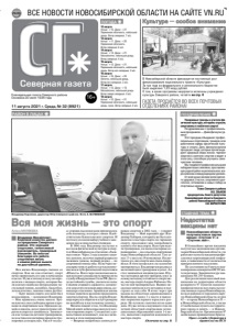 ВСЕ НОВОСТИ НОВОСИБИРСКОЙ ОБЛАСТИ НА САЙТЕ VN.RU 16+ Åæåíåäåëüíàÿ ãàçåòà Ñåâåðíîãî ðàéîíà. Îñíîâàíà 20 èþëÿ 1935 ãîäà ГАЗЕТА ПРОДАЁТСЯ ВО ВСЕХ ПОЧТОВЫХ ОТДЕЛЕНИЯХ РАЙОНА! 11 августа 2021 г. Среда, № 32 (8921) Северная газета 12 августа Ночью: +15. Днем: +21. Переменная облачность, небольшой дождь. Ветер северный, 7 м/с. 13 августа Ночью: +11. Днем: +20. Переменная облачность. Ветер северный, 6 м/с. 14 августа Ночью: +14. Днем: +21. Малооблачно, небольшой дождь. Ветер северный, 4 м/с. 15 августа Ночью: +12. Днем: +21. Переменная облачность, небольшой дождь. Ветер юго-западный, 3 м/с. 16 августа Ночью: +16. Днем: +22. Облачно, небольшой дождь. Ветер юго-западный, 3 м/с. 17 августа Ночью: +13. Днем: +19. Малооблачно, небольшой дождь. Ветер северо-западный, 4 м/с. 18 августа Ночью: +10. Днем: +21. Переменная облачность, небольшой дождь, гроза. Ветер западный, 2 м/с. ПОГОДА ПОЗДРАВЛЕНИE ГЛАВНАЯ ТЕМА РАЙОН В ЛИЦАХ Алёна МАТВЕЕВА JВладимир Михайлович Корняков известен далеко за пределами Северного района. Это хороший спортсмен, талантливый руководитель, примерный семьянин. Во многом благодаря его работе спортивная жизнь в нашем районе вышла на достойный уровень. Вся жизнь Владимира связана со спортом. Как он сам отмечает, спорт начал привлекать его уже в начальных классах. Иуже к пятому классу он определился с видами спорта, которые были для него наиболее интересными: настольный теннис, волейбол, баскетбол, легкая атлетика, лыжные гонки, футбол. — Круг видов спорта для меня был весьмаширок,—вспоминает Владимир. — Мне нравилось очень многое. Буквально все свое свободное время я проводил в спортивном зале. Приходил домой сошколы, делал урокии бежал обратно в спортзал заниматься. Занимался я не только на детских тренировках, но и оставался в вечернее время на тренировки для взрослых. Уже в 8-мклассе старшеклассникименя принимали к себе в команду, и я играл с ними. Ядействительно буквально жил спортом. И поэтому дляменя выбор учебного заведения после школы был очевиден. В 1996 году Владимир поступил в колледжфизической культурыи спорта вНовосибирске на отделение «Лыжные гонки». Через 2 года успешно защитил диплом, получил первый разряд по лыжным гонкам, первый разряд — по спортивной гимнастике. Иуже через месяцприступил к работе в детскомюношеском клубе физической подготовки «Юность». Всего через несколькомесяцев молодого специалиста призвалина службу вВооруженныеСилыРФ. Два года достойной службы, уволился в запас в звании старшего сержанта с должности заместителя командира взвода, командира отделения. Армейская жизнь только укрепила желание продолжить занятия спортом. После службыВладимир вернулся обратно в клуб тренером по волейболу и настольному теннису. Многие помнят о том, чтоВладимир Михайлович добился высоких результатов в гиревом спорте. Сегодня он с удовольствием вспоминает, как все начиналось в этом направлении. —Впервые попробовал заняться гиревым спортом в 2002 году, — говорит Владимир. — Мой хороший друг Владимир Хабаров, который уже был кандидатом в мастера спорта по гиревому спорту, предложил мне попробовать освоить этот вид спорта. Всего тринедели тренировок, и я поехал на первые соревнования—на сельские спортивные игры Новосибирской области. Там занял 13-е место из 14 возможных. Несмотря на это, вид спорта мне очень понравился. Яэтим загорелся и стал усиленно тренироваться. Влади
