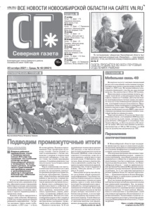 ВСЕ НОВОСТИ НОВОСИБИРСКОЙ ОБЛАСТИ НА САЙТЕ VN.RU 16+ Еженедельная газета Северного района. Основана 20 июля 1935 года ГАЗЕТА ПРОДАЁТСЯ ВО ВСЕХ ПОЧТОВЫХ ОТДЕЛЕНИЯХ РАЙОНА! 20 октября 2021 г. Среда, № 42 (8931) Северная газета 21 октября Ночью: +2. Днем: +10. Переменная облачность. Ветер южный, 4 м/с. 22 октября Ночью: +3. Днем: +7. Переменная облачность, небольшой дождь. Ветер юго-западный, 5 м/с. 23 октября Ночью: +2. Днем: +4. Пасмурно, небольшой снег с дождем. Ветер южный, 7 м/с. 24 октября Ночью: +6. Днем: +9. Пасмурно, небольшой дождь. Ветер западный, 6 м/с. 25 октября Ночью: +7. Днем: +9. Переменная облачность. Ветер юго-западный, 6 м/с. 26 октября Ночью: +5. Днем: +10. Ясно. Ветер южный, 6 м/с. 27 октября Ночью: –1. Днем: +8. Переменная облачность. Ветер западный, 8 м/с. ПОГОДА О ГЛАВНОМ КРАЕВЕДЧЕСКИЕ ЧТЕНИЯ По постановлению губернатора Новосибирской области был учрежден памятный нагрудный знак «Новосибирск — город трудовой доблести». О том, как получали награду в Северном районе, читайте на стр. 2 Фото из архива ЦБС (2019 год) Мария АПАЛЬКОВА JВпервые районные краеведческие чтения в Северном прошли осенью 2012 года под названием «По ступенькам столетий: история Новосибирской области» и посвящались 75-летию нашего региона. За время своего существования они приобрели широкий и целенаправленный характер и объединили большой круг любителей местной истории. К участию привлекаются представители музеев, архивной службы, образовательных учреждений, работники культуры, школьники, члены общественных объединений, муниципальные служащие, краеведы и просто неравнодушные к прошлому люди. Каждая встреча приурочена к какому-либо событию. Например, в 2014 году чтения прошли в рамках районного мероприятия — встречи земляков «Здесь наши глубокие корни», в 2013 году — в честь 80-летия района. В рамках празднования Года литературы состоялись чтения «Земли родной талант и вдохновенье» с целью знакомства с жизнью и творчеством писателей-сибиряков, в том числе с теми, чья судьба неразрывно связана с Северным районом и чьи писательские заслуги прославили северную землю. Число номинаций для выступлений ежегодно колеблется от двух до пяти, но, так или иначе, они всегда призваны раскрыть историю сёл, колхозов, предприятий, учреждений, общественных организаций района и рассказать о первых руководителях и работниках, развитии во времени и значении для села. Кроме этого, сообщения участников повествуют о событиях из прошлого или личностях, связанных с районом, знаменитых земляках, тружениках, семьях, династиях, оставивших добрый след в истории района. Всегда есть тема, освящающая жизнь и быт северян в годы Великой Отечественной войны (рассказы о ветеранах, тружениках тыла, детях войны, вдовах). Немного статистики. За 10 лет на районные чтения представлено 292 доклада, в том числе об истории четырех медицинских пунктов (больниц, ФАПов), семи сельских советов и 12 колхозов, семи сёл и пяти деревень, девяти школ и трех детских садов, 13 библиотек, двух музеев, Дома детского творчества, отдела архивной службы и др. Раскрыта история появления церквей, названий улиц, Совета женщин в районе. Описана жизнь 211 северян и 19 семей. Ежегодные встречи способствуют получению новой краеведческой информации. Участники чтений постоянно находятся в поиске неисследованных страниц истории района, края и в ходе подготовки получают бесценный 