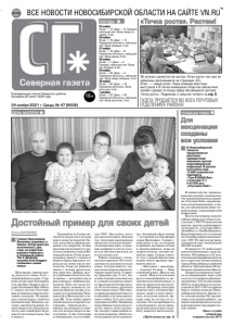 ВСЕ НОВОСТИ НОВОСИБИРСКОЙ ОБЛАСТИ НА САЙТЕ VN.RU 16+ Åæåíåäåëüíàÿ ãàçåòà Ñåâåðíîãî ðàéîíà. Îñíîâàíà 20 èþëÿ 1935 ãîäà ГАЗЕТА ПРОДАЁТСЯ ВО ВСЕХ ПОЧТОВЫХ ОТДЕЛЕНИЯХ РАЙОНА! 24 ноября 2021 г. Среда, № 47 (8936) Северная газета 25 ноября Ночью: —12. Днем: —9. Пасмурно, небольшой снег. Ветер северо-западный, 4 м/с. 26 ноября Ночью: —18. Днем: —13. Переменная облачность, небольшой снег. Ветер западный, 4 м/с. 27 ноября Ночью: —19. Днем: —8. Переменная облачность, небольшой снег. Ветер южный, 6 м/с. 28 ноября Ночью: —7. Днем: —4. Пасмурно, небольшой снег. Ветер юго-западный, 6 м/с. 29 ноября Ночью: —20. Днем: —4. Переменная облачность, небольшой снег. Ветер северо-западный, 4 м/с. 30 ноября Ночью: —22. Днем: —19. Переменная облачность. Ветер восточный, 3 м/с. 1 декабря Ночью: —23. Днем: —20. Переменная облачность, небольшой снег. Ветер восточный, 5 м/с. ПОГОДА ГЛАВНАЯ ТЕМА ДЕНЬ МАТЕРИ Большая семья Галины и Александра Яковлевых JВ Новосибирской области продолжается массовая прививочная кампания против коронавирусной инфекции. В регион поступило еще 13 800 комплектов препарата «Гам-КОВИД-Вак» («Спутник V») и 63 000 доз «Спутника Лайт». В министерстве здравоохранения региона напомнили, что однокомпонентная вакцина «Спутник Лайт» предназначена для ревакцинации, а также для вакцинации ранее переболевших коронавирусной инфекцией. Всего к настоящему моменту в Новосибирскую область поставлено 1 304 575 комплектов вакцин против коронавируса («Спутник V», «Спутник Лайт», «КовиВак» и «ЭпиВакКорона»). Вакцинировано по состоянию на 16 ноября первым компонентом 1 059 393 жителя региона, завершили курс вакцинации 880 040 человек. Развернуто 35 мобильных пунктов вакцинации, также работают 144 кабинета в 92 пунктах вакцинопрофилактики во всех взрослых поликлиниках города Новосибирска и районов области. Организовано 98 мобильных прививочных бригад. Открыта возможность записи на вакцинацию через сайт госуслуг и телефон единой регистратуры 124 в поликлинике №16 на левом берегу и в поликлиниках№27 и№7 на правом берегу любому жителю Новосибирской области. Кроме того, в поликлинике№1 организован отдельный кабинет, где можно вакцинироваться по живой очереди без предварительной записи. Пресс-служба губернатора и правительства НСО Для вакцинации созданы все условия «Точка роста». Растем! Алёна МАТВЕЕВА JГалина Николаевна Яковлева родилась в Омске. Когда девочке исполнилось два года, ее родители решили переехать в Северный район. Так в далеком поселке Коб-Кордон появилась новая семья. Шло время, девочка росла, росла и ее семья. Галя — второй ребенок в семье. Старшую сестру зовут Екатерина, есть еще брат Эдуард и две сестры-близняшки Яна и Вика. С самого детства Галя привыкла помогать маме воспитывать младших. Ей нравилось с ними играть, помогать познавать мир. Наверное, поэтому, еще будучи юной, Галина твердо для себя решила, что и у нее самой будет большая и счастливая семья. Так и вышло. Трудовой путь Галина начинала в своем селе в детском доме в качестве вожатой. Потом, когда было принято решение о его закрытии, Галине предложили должность учителя английского языка в Витинской школе. И она не раздумывая, вместе с сыном от первого брака Аркадием переехала на новое место жительства. Семь лет работы в школе с детьми пролетели, как один миг. Добрая, всегда улыбчивая и веселая учительница — детям было жаль расставаться с любимы