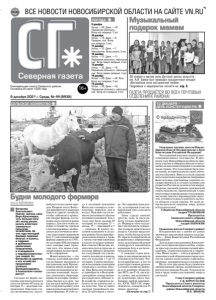 ВСЕ НОВОСТИ НОВОСИБИРСКОЙ ОБЛАСТИ НА САЙТЕ VN.RU 16+ Åæåíåäåëüíàÿ ãàçåòà Ñåâåðíîãî ðàéîíà. Îñíîâàíà 20 èþëÿ 1935 ãîäà ГАЗЕТА ПРОДАЁТСЯ ВО ВСЕХ ПОЧТОВЫХ ОТДЕЛЕНИЯХ РАЙОНА! 8 декабря 2021 г. Среда, № 49 (8938) Северная газета 9 декабря Ночью: —26. Днем: —18. Переменная облачность. Ветер юго-западный, 5 м/с. 10 декабря Ночью: —16. Днем: —8. Пасмурно, снег. Ветер юго-западный, 5 м/с. 11 декабря Ночью: —12. Днем: —7. Малооблачно. Ветер южный, 5 м/с. 12 декабря Ночью: —15. Днем: —11. Переменная облачность, небольшой снег. Ветер северо-западный, 4 м/с. 13 декабря Ночью: —25. Днем: —16. Переменная облачность, небольшой снег. Ветер северо-западный, 4 м/с. 14 декабря Ночью: —28. Днем: —26. Ясно. Ветер юго-западный, 3 м/с. 15 декабря Ночью: —26. Днем: —16. Переменная облачность, небольшой снег. Ветер юго-западный, 5 м/с. ПОГОДА 12 ДЕКАБРЯ — ДЕНЬ КОНСТИТУЦИИ РФ СЕЛЬСКОЕ ХОЗЯЙСТВО Уважаемые земляки, жители Новосибирской области! Поздравляем вас с Днем Конституции Российской Федерации! Это основной документ нашего многонационального государства. В прошлом году Новосибирская область приняла участие в общероссийском голосовании по внесению поправок в основной закон страны. Это голосование было уникальным, историческим по своей значимости событием. Вместе со всей страной жители региона поддержали поправки в Конституцию, призванные укрепить государственность и создать условия для развития России на десятилетия вперед. Уверены, высокий уровень гражданской ответственности, проявленный в ходе подготовки и проведения голосования, наглядно показал неравнодушие жителей, готовность вместе работать на благо области и всей страны. От всей души желаем всем здоровья, мира, успеха и благополучия! Губернатор Новосибирской области Андрей ТРАВНИКОВ Председатель Законодательного собрания Новосибирской области Андрей ШИМКИВ *** Уважаемые жители Северного района! Поздравляем вас с одним из самых значимых праздников нашего государства — Днем Конституции Российской Федерации! Для каждого россиянина Конституция стала гарантом прав и свобод, открыла простор для реализации личной инициативы, самостоятельности и творчества. Наша задача — чтить и хранить заложенные в ней общенациональные ценности, строить на их основе стабильное, правовое, демократическое государство. Пусть этот праздник будет символом процветающей страны, незыблемым гарантом для граждан России. Успехов всем нам в труде, новых достижений, мира и согласия! Глава Северного района С.В. КОРОСТЕЛЕВ Председатель Совета депутатов Новосибирской области Северного района Новосибирской области И.В. ЗВЫКОВ Алёна МАТВЕЕВА JВячеслав Анатольевич Невтис, житель села Верх-Красноярка, чуть больше пяти лет назад решил начать вплотную заниматься сельским хозяйством. За эти годы молодой фермер пережил многое: и взлеты, и падения, и добивался увеличения показателей, и сталкивался с недобросовестностью людей. Но Вячеслав не сдается, и его хозяйство продолжает успешно функционировать, а показатели только растут. Сегодня на ферме поголовье крупного рогатого скота составляет 45 голов, из которых 15 —молочного направления. Ежегодно стадо увеличивается, массовый растел идет своим чередом. Помимо этого, Вячеслав приобретает племенных быков из других хозяйств, чтобы «обновлять кровь», как говорит фермер, для зимовки скота строятся новые корпуса. Для того чтоб