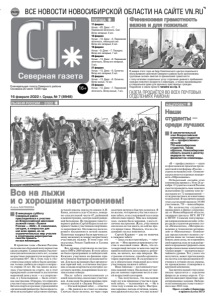 ВСЕ НОВОСТИ НОВОСИБИРСКОЙ ОБЛАСТИ НА САЙТЕ VN.RU 16+ Åæåíåäåëüíàÿ ãàçåòà Ñåâåðíîãî ðàéîíà. Îñíîâàíà 20 èþëÿ 1935 ãîäà ГАЗЕТА ПРОДАЁТСЯ ВО ВСЕХ ПОЧТОВЫХ ОТДЕЛЕНИЯХ РАЙОНА! 16 февраля 2022 г. Среда, № 7 (8948) Северная газета 17 февраля Ночью: –20. Днем: –17. Переменная облачность. Снег. Ветер западный, 9 м/с. 18 февраля Ночью: –10. Днем: –4. Переменная облачность, небольшой снег. Ветер юго-западный, 8 м/с. 19 февраля Ночью: –9. Днем: –7. Пасмурно. Ветер юго-западный, 7 м/с. 20 февраля Ночью: –13. Днем: –9. Переменная облачность. Ветер юго-западный, 9 м/с. 21 февраля Ночью: –15. Днем: –9. Солнечно. Ветер юго-западный, 9 м/с. 22 февраля Ночью: –13. Днем: –9. Солнечно. Ветер южный, 10 м/с. 23 февраля Ночью: –12. Днем: –7. Переменная облачность. Ветер южный, 7 м/с. ПОГОДА НАЦПРОЕКТ ЛЫЖНЯ РОССИИ — 2022 На старте «Лыжни России» JВ заключительный этап Всероссийской олимпиады студентов «Я — профессионал» прошли 719 новосибирских студентов. Таким образом, Новосибирская область вошла в десятку лидеров по числу финалистов олимпиады. «Я— профессионал» — один из флагманских проектов президентской платформы «Россия — страна возможностей». Олимпиада реализуется в рамках нацпроекта «Образование». Отборочный онлайн-этап олимпиады прошел с 10 по 26 декабря. Студенты со всей России смогли проверить свои знания в испытаниях по одному или нескольким из 72 направлений — от журналистики до квантовых технологий. В заключительный этап состязаний прошли 34 840 участников, 719 —новосибирцы. По количеству студентов, прошедших в финал олимпиады от Новосибирской области, лидируют три вуза: НГУ, НГТУ и НГПУ. Самыми популярными направлениями онлайн-отбора среди студентов региона стали «Психология», «Материаловедение и технологии материалов» и «Математика». Олимпиада предоставляет нашим студентам шанс не только попробовать свои силы, но и проявить свой характер, ведь не каждый решится продемонстрировать свои профессиональные компетенции членам жюри— экспертам высочайшего уровня. Тот, у кого это получится, может претендовать на льготы для продолжения обучения в лучших вузах страны, на прохождение стажировки в крупной компании. Заключительный этап олимпиады продлится с середины февраля до конца апреля. Студентов ожидают практико-ориентированные задания. Победители олимпиады станут известны в мае 2022 года. Пресс-служба губернатора и правительства НСО Наши студенты — среди лучших Финансовая грамотность важна и для пожилых Алёна МАТВЕЕВА JВ минувшую субботу Северный район присоединился к участию во Всероссийской массовой лыжной гонке «Лыжня России — 2022». К сожалению, сегодня, в непростое для нас всех время, из-за ограничительных мер участие в спортивном мероприятии смогли принять не все желающие. В прошлые годы «Лыжня России» пользовалась большой популярностью среди северян. Самым юным участникам едва исполнилось пять лет, а самые возрастные перешагнули возрастную категорию 60+. Но в этом году к участию в массовом забеге были допущены только любители спорта в возрасте старше 18 лет. Не так много оказалось участников на старте, но в этот прекрасный солнечный и достаточно морозный день у всех — и у спортсменов, и у болельщиков — было отличное настроение. Отрадно, что принять участие в массовом забеге пришли любители спорта из разных учреждений и организаций райцентра: были представители культурно-досугов