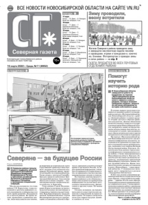 ВСЕ НОВОСТИ НОВОСИБИРСКОЙ ОБЛАСТИ НА САЙТЕ VN.RU 16+ Åæåíåäåëüíàÿ ãàçåòà Ñåâåðíîãî ðàéîíà. Îñíîâàíà 20 èþëÿ 1935 ãîäà ГАЗЕТА ПРОДАЁТСЯ ВО ВСЕХ ПОЧТОВЫХ ОТДЕЛЕНИЯХ РАЙОНА! 16 марта 2022 г. Среда, №11 (8952) Северная газета 17 марта Ночью: – 15. Днем: – 8. Пасмурно. Ветер юго-западный, 5 м/с. 18 марта Ночью: – 17. Днем: – 7. Переменная облачность. Ветер юго-западный, 2 м/с. 19 марта Ночью: – 14. Днем: – 5. Переменная облачность. Ветер северо-западный, 4 м/с. 20 марта Ночью: – 9. Днем: – 5. Пасмурно. Ветер юго-западный, 6 м/с. 21 марта Ночью: – 8. Днем: – 2. Пасмурно. Ветер юго-западный, 7 м/с. 22 марта Ночью: – 6. Днем: 0. Малооблачно. Ветер юго-западный, 5 м/с. 23 марта Ночью: – 6. Днем: – 2. Переменная облачность, небольшой снег. Ветер юго-западный, 7 м/с. ПОГОДА В ПОДДЕРЖКУ ВАЖНО ЗНАТЬ Зиму проводили, весну встретили Фото А. Ильдерова Жители Северного района проводили зиму и завершили масленичную неделю песнями и хороводами, играми и конкурсами и, конечно же, блинами. Фоторепортаж о проводах зимы в селах района — на стр. 8 JВ Новосибирской области завершается работа по внедрению на портале «Мультимедийный архив Новосибирской области» нового сервиса и нового раздела, которые позволят гражданам подавать запросы на изучение материалов по истории собственного рода. В течение первого полугодия планируется завершить работу по внедрению на портале «Мультимедийный архив Новосибирской области» сервиса «Личный кабинет» и нового раздела «Сервис доступа к образам архивных документов». Данные обновления позволят подавать запросы в государственный архив Новосибирской области, направлять заявку на предоставление интересующих документов, изготовление их копий, просматривать скан-образы метрических книг и других материалов по изучению истории рода. На портале «Мультимедийный архив Новосибирской области» уже размещены оцифрованные документы, находящиеся на хранении государственного и муниципальных архивов региона, подшивки газет периода Великой Отечественной войны. В разделе «Тематические базы данных» представлена информация о награжденных в годы войны, а также эвакуированных в Новосибирскую область. В разделе «Тематические выставки» размещены материалы, посвященные присвоению Новосибирску почетного звания «Город трудовой доблести». Кроме того, представленные материалы отражены в книге «Новосибирск — город трудовой доблести». С изданием все желающие могут ознакомиться в разделе «Электронная библиотека». В 2021 году силами сотрудников архивов региона было создано около 4млн скан-образов, с начала работыпо оцифровке — порядка 40 млн скан-образов. Темпыработыданногонаправления будут сохранятьсяидалее. Сцельюпривлеченияшкольников кработе с архивными документами в этом году будет проведен конкурс учебно-исследовательских работ «Юный архивист» на лучшуюработу с использованиемонлайн-платформы «Мультимедийный архив НСО». Пресс-служба губернатора и правительства НСО Помогут изучить историю рода Раиса АКИЛИНА JВ Северном районе прошли акции в поддержку решения президента Российской Федерации Владимира Владимировича Путина о признании независимости Луганской и Донецкой Народных Республик и проведения специальной операции. Мы уже рассказывали, что глава района С.В. Коростелев, главы поселений и депутаты районного совета поддержали судьбоносные для всей страны решения. По