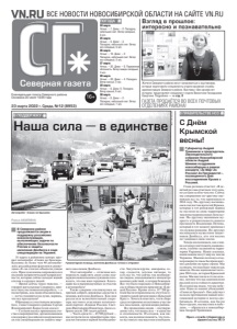 16+ Еженедельная газета Северного района. Основана 20 июля 1935 года ГАЗЕТА ПРОДАЁТСЯ ВО ВСЕХ ПОЧТОВЫХ ОТДЕЛЕНИЯХ РАЙОНА! ВСЕ НОВОСТИ НОВОСИБИРСКОЙ ОБЛАСТИ НА САЙТЕ VN.RU 23 марта 2022 г. Среда, №12 (8953) Северная газета 24 марта Ночью: – 7. Днем: – 2. Пасмурно, небольшой снег. Ветер западный, 6 м/с. 25 марта Ночью: – 9. Днем: – 3. Пасмурно, небольшой снег. Ветер юго-западный, 9 м/с. 26 марта Ночью: – 16. Днем: – 2. Пасмурно, небольшой снег. Ветер юго-западный, 9 м/с. 27 марта Ночью: – 26. Днем: – 8. Переменная облачность. Ветер северо-западный, 3 м/с. 28 марта Ночью: – 20. Днем: – 4. Пасмурно. Ветер южный, 5 м/с. 29 марта Ночью: – 8. Днем: 0. Пасмурно. Ветер южный, 6 м/с. 30 марта Ночью: – 8. Днем: – 2. Пасмурно, небольшой снег. Ветер юго-западный, 7 м/с. ПОГОДА Взгляд в прошлое: интересно и познавательно Жители Северного района могут ознакомиться с выставками, которые подготовили специалисты отдела архивной службы администрации Северного района. Выставку «Без архива нет истории» представляет специалист отдела Валентина Геннадьевна Смертина. Подробнее — на стр. 2 В ПРАВИТЕЛЬСТВЕ НСО С Днём Крымской весны! JГубернатор Андрей Травников и председатель Законодательного собрания Новосибирской области Андрей Шимкив поздравили новосибирцев в рамках концерта «Zа Мир! Zа Россию! Zа Президента!», посвященного Дню воссоединения Крыма с Россией. Глава региона отметил: «В девятый раз мы отмечаем этот день, но сегодня особое чувство. Сейчас мы совершенно по-другому оцениваем все то, что произошло в 2014 году. По-другому восхищаемся смелостью жителей Крыма, которые в тот рубежный период не пустили на свою территорию эшелоны национальных батальонов. По-другому оцениваем мудрость и решительность нашего президента Владимира Путина, который в тот момент принимал это нужное решение. По-другому восхищаемся мужеством защитников Донбасса, кто эти восемь лет защищал свою землю. Теперь мы понимаем, как сложно сегодня уничтожить национализм, глубоко засевший на территории Украины. Наши земляки, наши воины несут мир на землю Украины. Именно поэтому сегодня развернуто такое беспрецедентное давление на нашу страну. Мы осознаем, что нам будет тяжело как никогда. Но нас вдохновляет история 2014 года, история Крымской весны. Мы выстояли и стали сильнее, потому что нас вдохновляли русский дух и стойкость крымчан. И сегодня мы знаем, что мы победим. Одно из наших убеждений: «Своих не бросаем!». Оно действует на всем протяжении нашей многовековой истории и всегда срабатывало. И сегодня, как бы ни было трудно, мы выстоим и победим», — обратился к новосибирцам Андрей Травников. Пресс-служба губернатора и правительства НСО Раиса АКИЛИНА JВ Северном районе продолжаются акции в поддержку российских военнослужащих, выполняющих задачи по обеспечению безопасности России и защиты населения Донбасса в ходе спецоперации на Украине. 18 марта в районном центре прошел автопробег «Своих не бросаем». Колонна из более чем 40 автомобилей с российскими флагами и символами «Z» на стеклах объехали улицы села. Проезд колонны сопровождался песнями патриотической направленности, которые сейчас находят живой отклик в сердцах людей. — Время сейчас такое тяжелое, — говорит жительница Северного, приветствуя участников автопробега, — а посмотришь, как люди объединились, — легче становится на душе, веришь, что все преодолеем! Обращаясь к уча