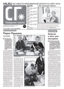 16+ Еженедельная газета Северного района. Основана 20 июля 1935 года ГАЗЕТА ПРОДАЁТСЯ ВО ВСЕХ ПОЧТОВЫХ ОТДЕЛЕНИЯХ РАЙОНА! ВСЕ НОВОСТИ НОВОСИБИРСКОЙ ОБЛАСТИ НА САЙТЕ VN.RU 15 июня 2022 г. Среда, №24 (8965) Северная газета 16 июня Ночью: +11. Днем: +19. Переменная облачность, дождь, гроза. Ветер западный, 6 м/с. 17 июня Ночью: +13. Днем: +22. Облачно, дождь, гроза. Ветер западный, 6 м/с. 18 июня Ночью: +14. Днем: +24. Переменная облачность, небольшой дождь, гроза. Ветер западный, 2 м/с. 19 июня Ночью: +15. Днем: +24. Переменная облачность, дождь, гроза. Ветер южный, 2 м/с. 20 июня Ночью: +17. Днем: +26. Переменная облачность, небольшой дождь, гроза. Ветер южный, 4 м/с. 21 июня Ночью: +17. Днем: +27. Переменная облачность. Ветер юго-восточный, 7 м/с. 22 июня Ночью: +18. Днем: +27. Переменная облачность, дождь. Ветер юго-восточный, 6 м/с. ПОГОДА «По страницам памяти» В Новосибирской области прошел V конкурс чтецов «По страницам памяти», посвященный празднованию Дня Победы в Великой Отечественной войне. Северный район на конкурсе представляли шесть обучающихся школ района. Подробнее на стр. 2 ПАТРИОТИЧЕСКОЕ ВОСПИТАНИЕ Энергия и опыт для молодёжи JМинистерство региональной политики Новосибирской области информирует о проведении в регионе конкурса проектов в сфере патриотического воспитания «Позиция — Энергия — Опыт». Свои наработки для молодежи смогут представить ветеранские организации региона. Старт заявок на участие в IV областном конкурсе-смотре лучших практик работы с молодежью ветеранских организаций «Позиция — Энергия — Опыт» объявлен Центром патриотического воспитания Новосибирской области. В конкурсе могут принять участие ветеранские организации муниципальных районов и городских округов Новосибирской области, иные общественные организации, объединяющие представителей старшего поколения и имеющие статус юридического лица. В числе направлений конкурсных работ — просветительская деятельность (история и сохранение исторической памяти, поддержка специальной военной операции), противодействие идеологии терроризма и профилактика экстремизма, предупреждение межнациональных и межконфессиональных конфликтов. Также могут быть представлены проекты по краеведению, профессиональной ориентации, решению экологических проблем малой родины, популяризации здорового образа жизни и занятий физической культурой и спортом, развитию творческих способностей, иные проекты, направленные на гражданско-патриотическое воспитание подростков и молодежи. Работы принимаются до 30 июля 2022 года. Участники конкурса, занявшие с 1-го по 10-е места, награждаются дипломами победителей и лауреатов, а также тематической поездкой в один из городов-героев/городов воинской славы/городов трудовой доблести России. Подробности участия в конкурсе можно посмотреть на сайте Центра патриотического воспитания. ДЕНЬ РУССКОГО ЯЗЫКА Парки Пушкина Алёна МАТВЕЕВА JВ рамках областного образовательно-просветительского проекта «Парки Пушкина» 6 июня, в День русского языка в России, в парке культуры и отдыха Северного было организовано интересное мероприятие, посвященное Пушкинскому дню. В рамках проведения праздника образовательные и культурные учреждения райцентра организовали работу различных интерактивных площадок. Педагоги школы искусств предлагали всем желающим изобразить сказки Пушкина витражными красками. Пе