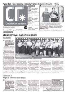 16+ Еженедельная газета Северного района. Основана 20 июля 1935 года ГАЗЕТА ПРОДАЁТСЯ ВО ВСЕХ ПОЧТОВЫХ ОТДЕЛЕНИЯХ РАЙОНА! ВСЕ НОВОСТИ НОВОСИБИРСКОЙ ОБЛАСТИ НА САЙТЕ VN.RU 7 сентября 2022 г. Среда, №36 (8977) Северная газета 8 сентября Ночью: +2. Днем: +12. Переменная облачность. Ветер западный, 5 м/с. 9 сентября Ночью: +7. Днем: +13. Пасмурно, небольшой дождь. Ветер западный, 5 м/с. 10 сентября Ночью: +6. Днем: +15. Пасмурно. Ветер южный, 3 м/с. 11 сентября Ночью: +6. Днем: +12. Переменная облачность. Ветер северный, 4 м/с. 12 сентября Ночью: +5. Днем: +11. Пасмурно. Ветер юго-западный, 5 м/с. 13 сентября Ночью: +6. Днем: +18. Облачно. Ветер юго-западный, 4 м/с. 14 сентября Ночью: +6. Днем: +17. Переменная облачность. Ветер южный ПОГОДА 31 августа в культурно-досуговом центре с. Северное состоялось августовское совещание педагогических работников Северного района. По сложившейся традиции на нем подвели итоги прошедшего учебного года, наметили планы на будущий год и наградили достойных учителей. Подробности на стр. 5. АКТУАЛЬНО Первый миллион тонн зерна JЗерновые культуры в Новосибирской области убраны на площади 462 тысячи га, что составляет 30% от общей уборочной площади зерновых. Урожайность высокая, и аграрии уже намолотили первый миллион тонн зерна. В 2022 году в регионе значительно увеличена государственная поддержка аграриев, которая дает возможность качественнее и оперативнее подготовиться к сезонным полевым работам, в том числе — к уборочной. Уборочную кампанию ведут все районы Новосибирской области. Зерновые и зернобобовые культуры скошены с площади 462,5 тысяч га (30,4%), обмолочены — на 439,4 тысяч га. Наиболее высокие темпы уборки набрали хозяйства Сузунского (убрано 46% площадей), Краснозерского (43%), Маслянинского и Купинского районов (более 40% площадей). «Валовой сбор зерна уже составил 1 млн 58 тысяч тонн при урожайности 24 центнера с гектара. В этом году из областного бюджета на господдержку аграриев выделено 3,4 миллиарда рублей — колоссальные средства, это вдвое больше, чем в прошлом году. Большая часть этих средств направлена на техническое переоснащение сельского хозяйства», — сообщил заместитель председателя правительства —министр сельского хозяйства региона Евгений Лещенко. Пресс-служба губернатора и правительства НСО ДЕНЬ ЗНАНИЙ Здравствуй, родная школа! Алена МАТВЕЕВА JПо всей стране 1 сентября празднуется День знаний. Ребята после длительных летних каникул собираются на торжественную линейку. Белые банты, яркие букеты цветов, радостные улыбки: школьники соскучились по своим друзьям и учителям. Впереди их ожидают интересные открытия, новые знания. В Витинской основной школе в этом году 29 обучающихся. Впервые за 30 лет здесь нет первоклассников. В 9-й класс перешли трое парней. На торжественной линейке, посвященной Дню знаний, собрались родители, бабушки и дедушки, самые близкие люди. С этого года на пост директора школы заступает Наталья Александровна Горбунова. Более 30 лет она посвятила работе в сфере образования и на новой должности постарается сделать учебу ребят и работу педагогов комфортнее и эффективнее. Большая часть мероприятия была посвящена награждениям. Так, в летний период ребята принимали участие в конкурсе детских рисунков «Охрана труда глазами детей». Сертификат за участие вручен Ангелине Яковлевой, Матвею Ермакову, Полине Семеновой, Юле Сергеевой, Виктори